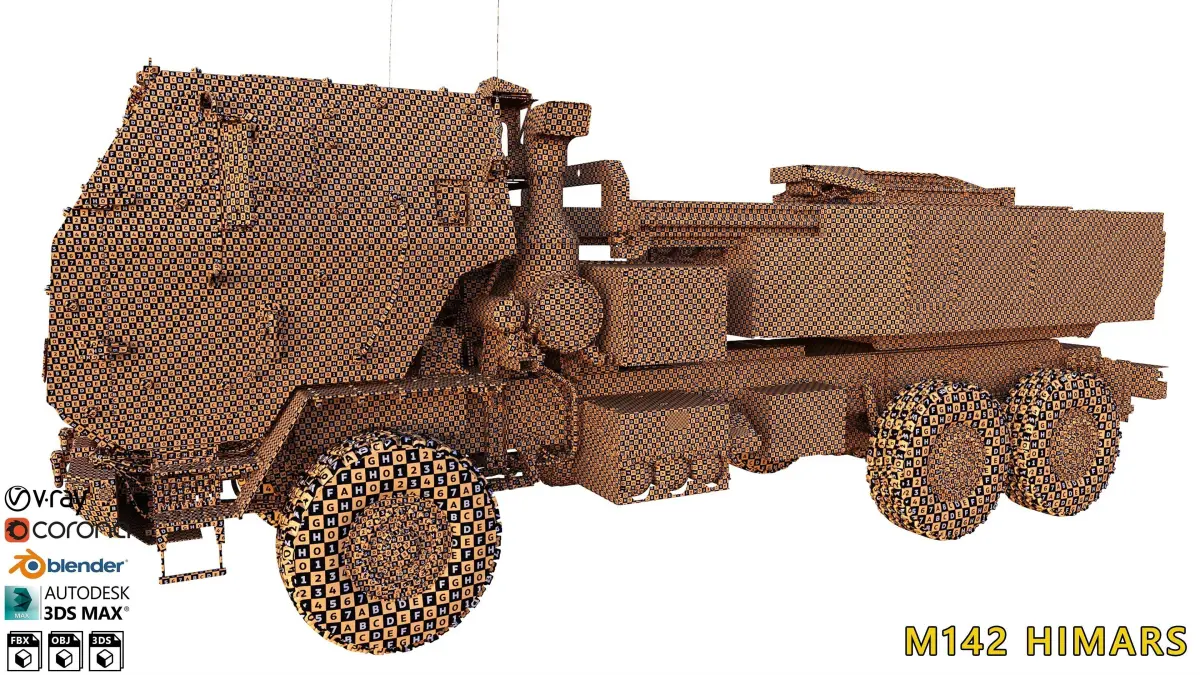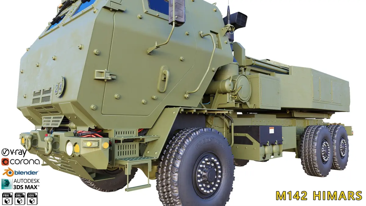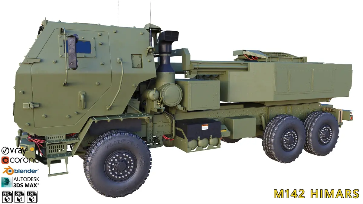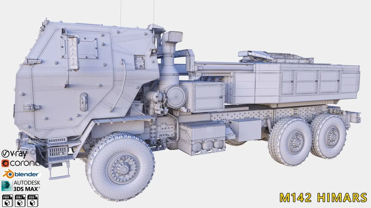 This Set includes 16 separated objects what entirely represent M142 HIMARS can be used in your scene, in different 3dsoft.