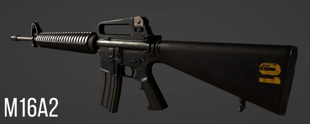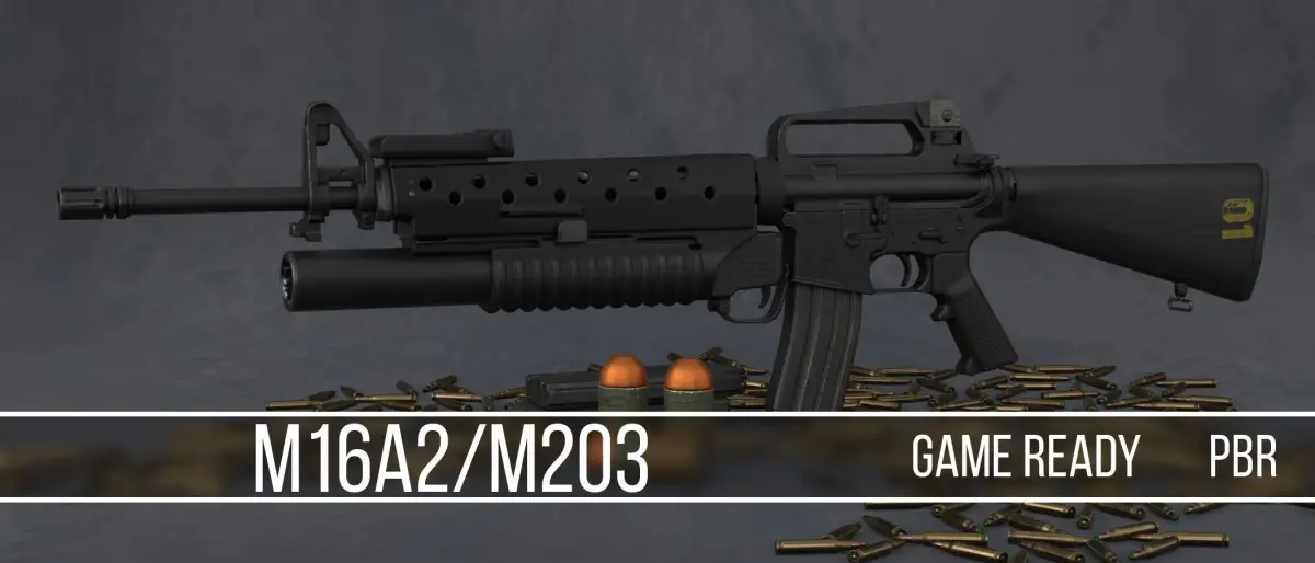 Desert Storm era M16A2 assault rifle with M203 grenade launcher, perfect for your military FPS. Low poly game ready model, suitable for game and rendering projects.