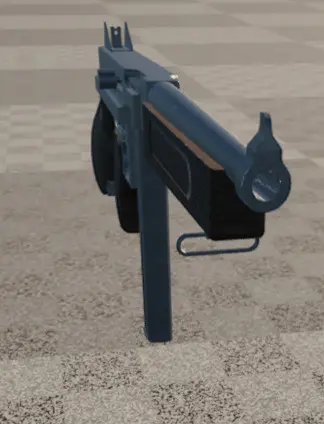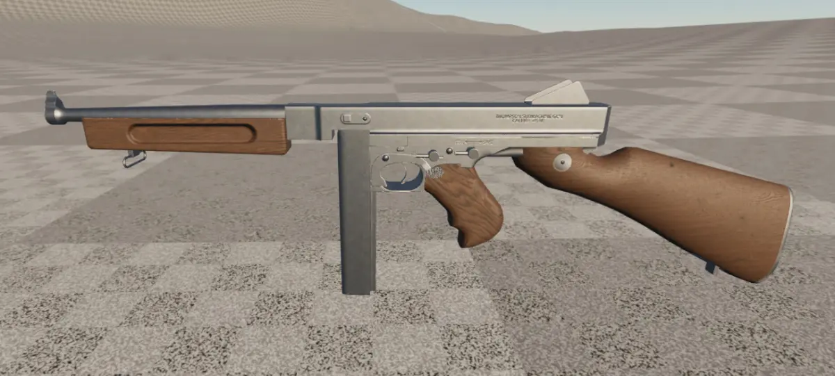 The M1A1 Thompson Submachinegun was used by the US military, originally derived from the M1928A1 Thompson it has a few changes, the charging handle was moved from the top of the receiver to the side, it is also incapable of using drum magazines, and has changed from changeable sights to fixed ones of a much simpler variety, featuring an aperture and open notch sight. Chambered in .45ACP it was a simplified version of the original Thompson meant to be cheaper for wartime manufacture. Despite it's inception being in inter-war years, it would have a long life seeing limited use up to the Vietnam war. The model present has a thirty round magazine with rigging and bones for all applicable parts, the stock is as well detachable to make it more portable for use cases where that would be desirable. As well the fire selector is rigged too allowing the user to choose between full and semi-auto.