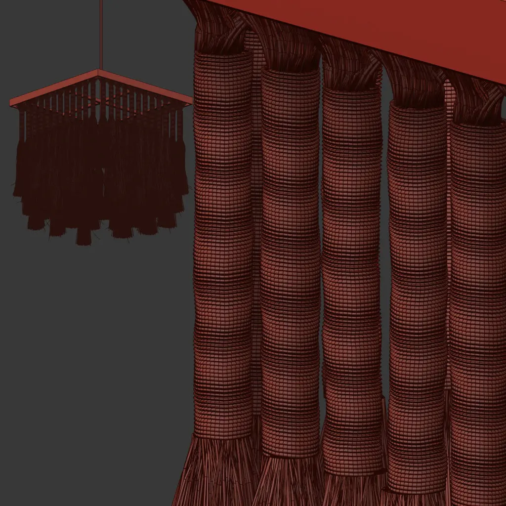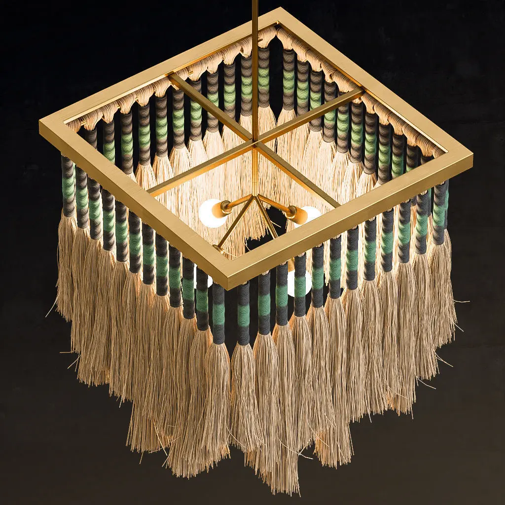 The 24 "square Sabine fixture. Crated in solid brass, available with or without the solid kamagong wood beads, also available with either our linen skirt fringe or tassels.