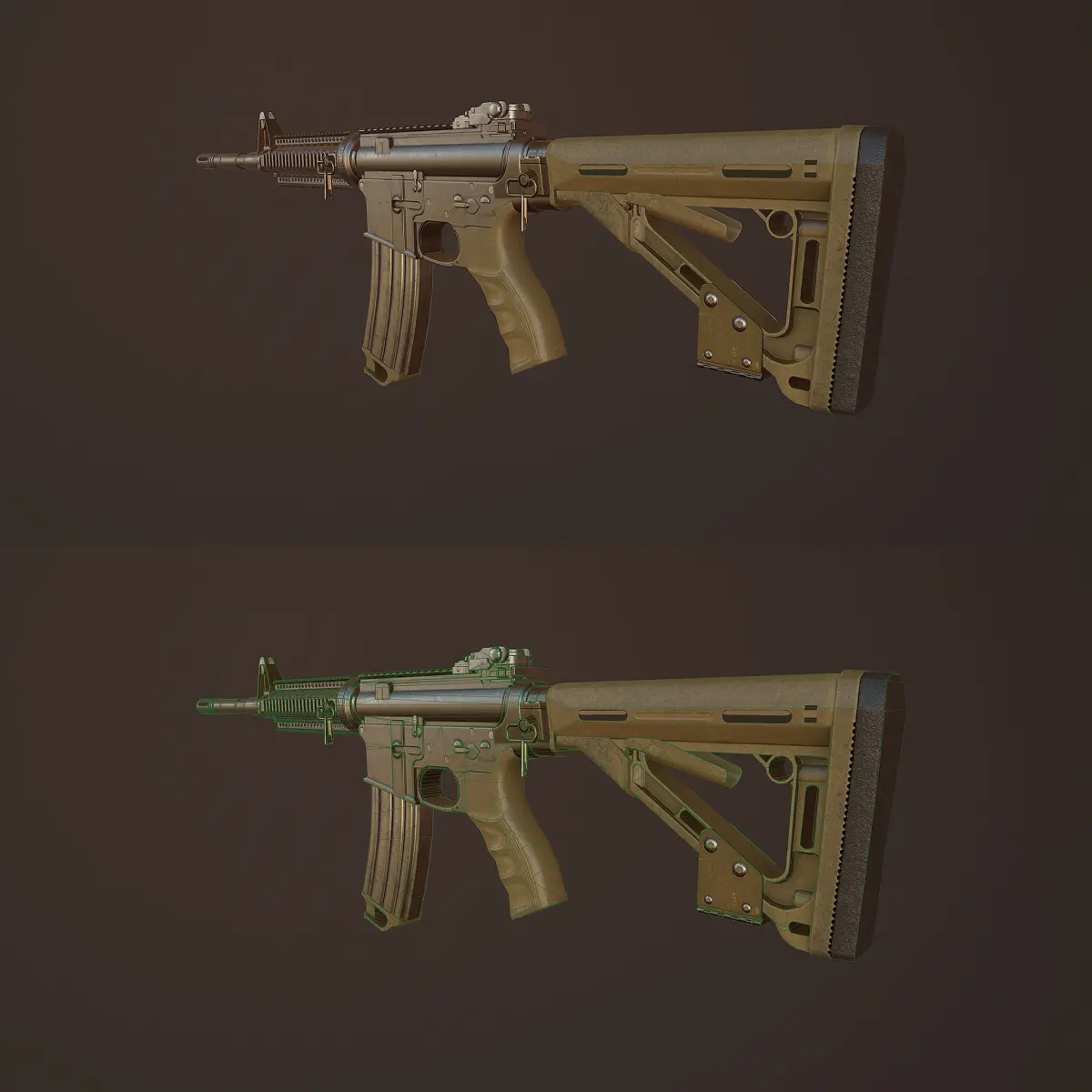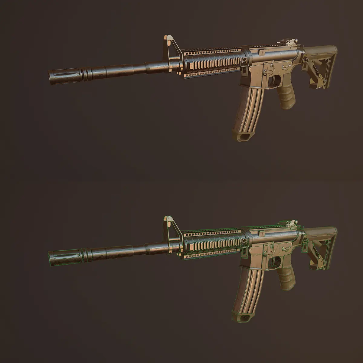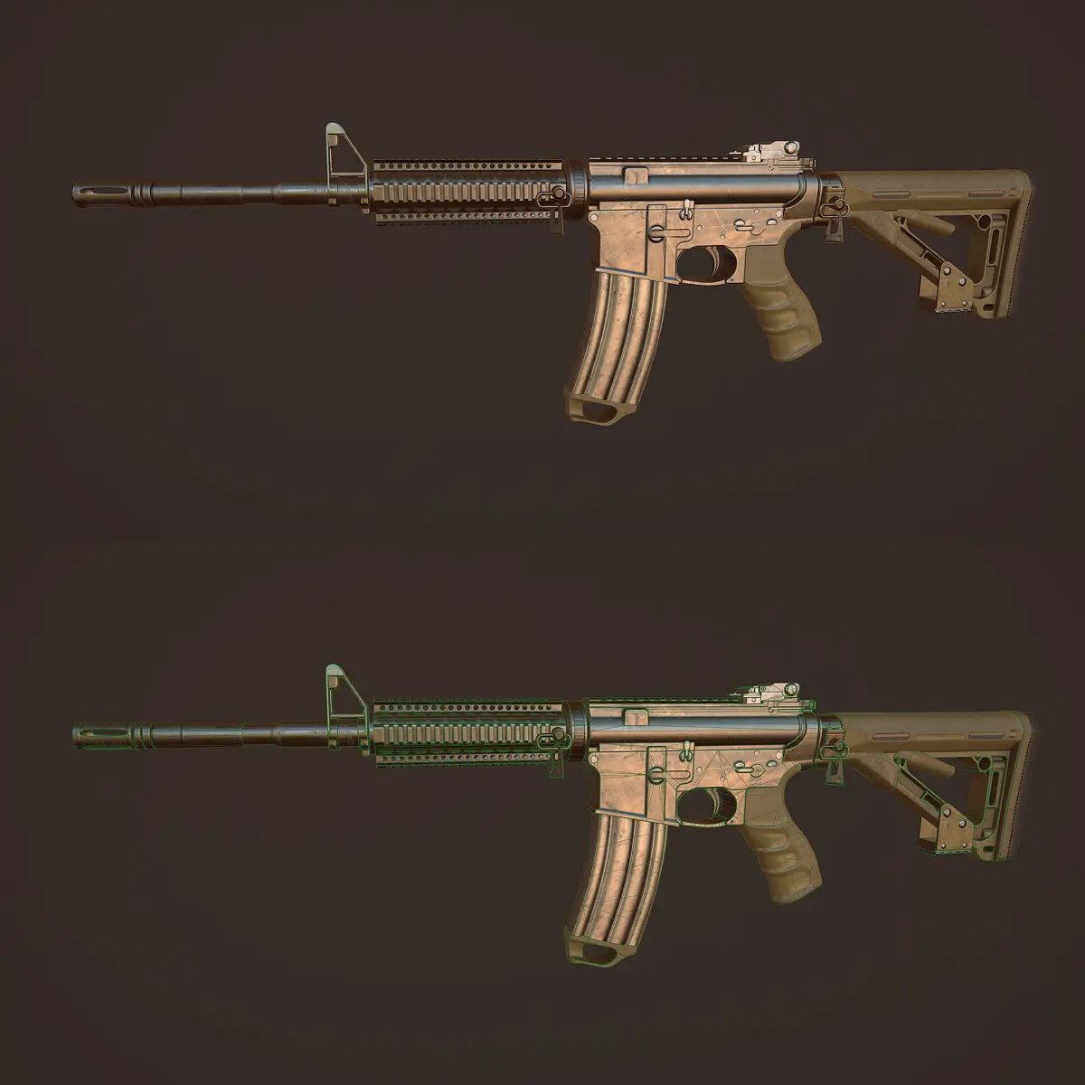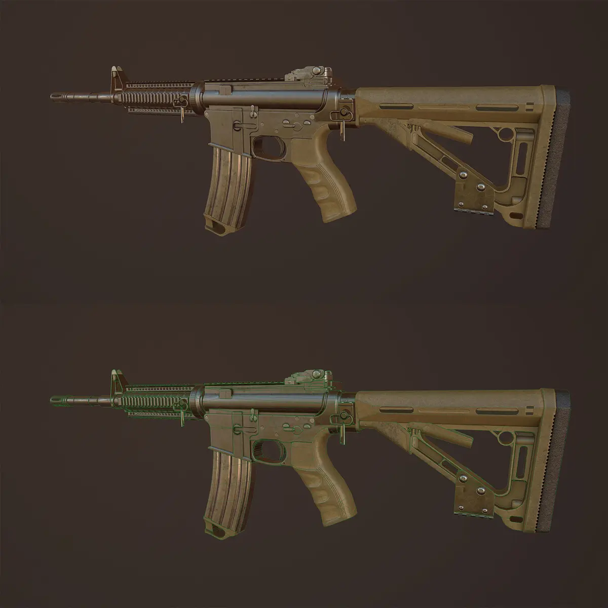 A realistic low poly model of a M4 carbine with normal,albedo(alpha map include),roughness and metalness map. Very high detail model, enabling close up renders. Originally modeled and rendered in Marmoset Toolbag 2.08. Render ready materials and textures available in tga format.PBR texture.
