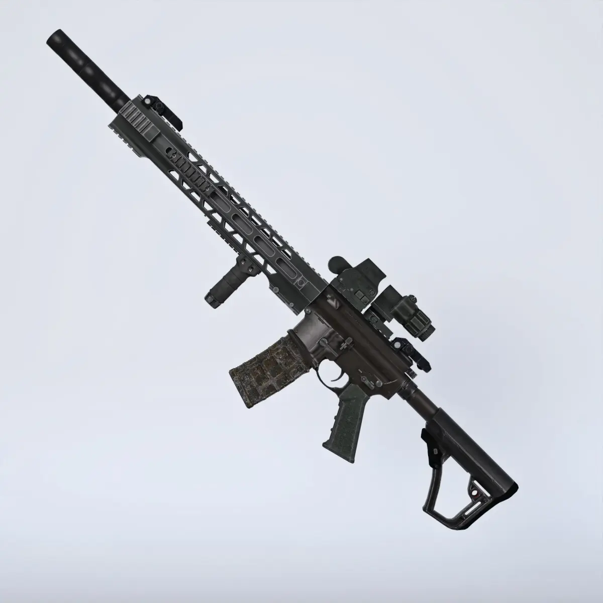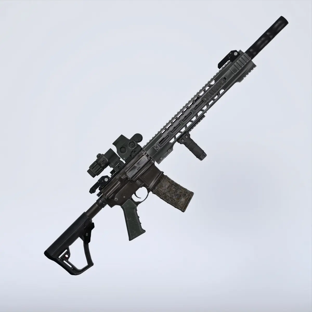 Bolt riggedCharging handle riggedSilencer riggedFront grip riggedDights riggedStock RiggedMagnifier rigged and foldsRed Dot riggedBolt cover riggedTrigger riggedSafety rigged