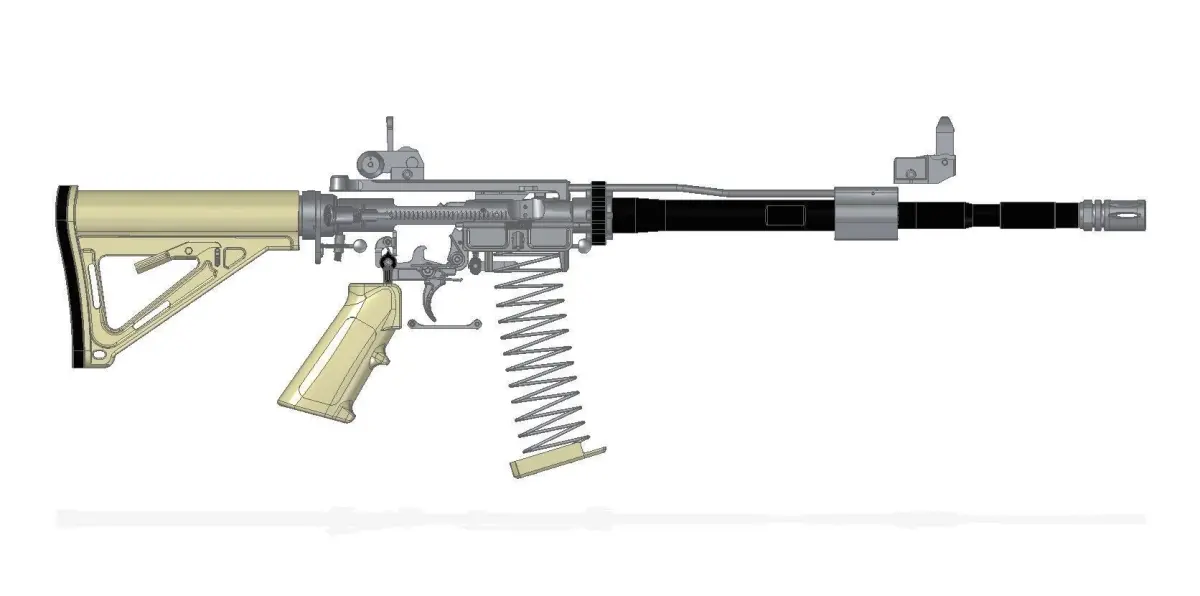 Full assembled model of Colt M4A1 rifle with 30 round Magpul mag, Madbull handguard and 5,56 mm Nato bullet.