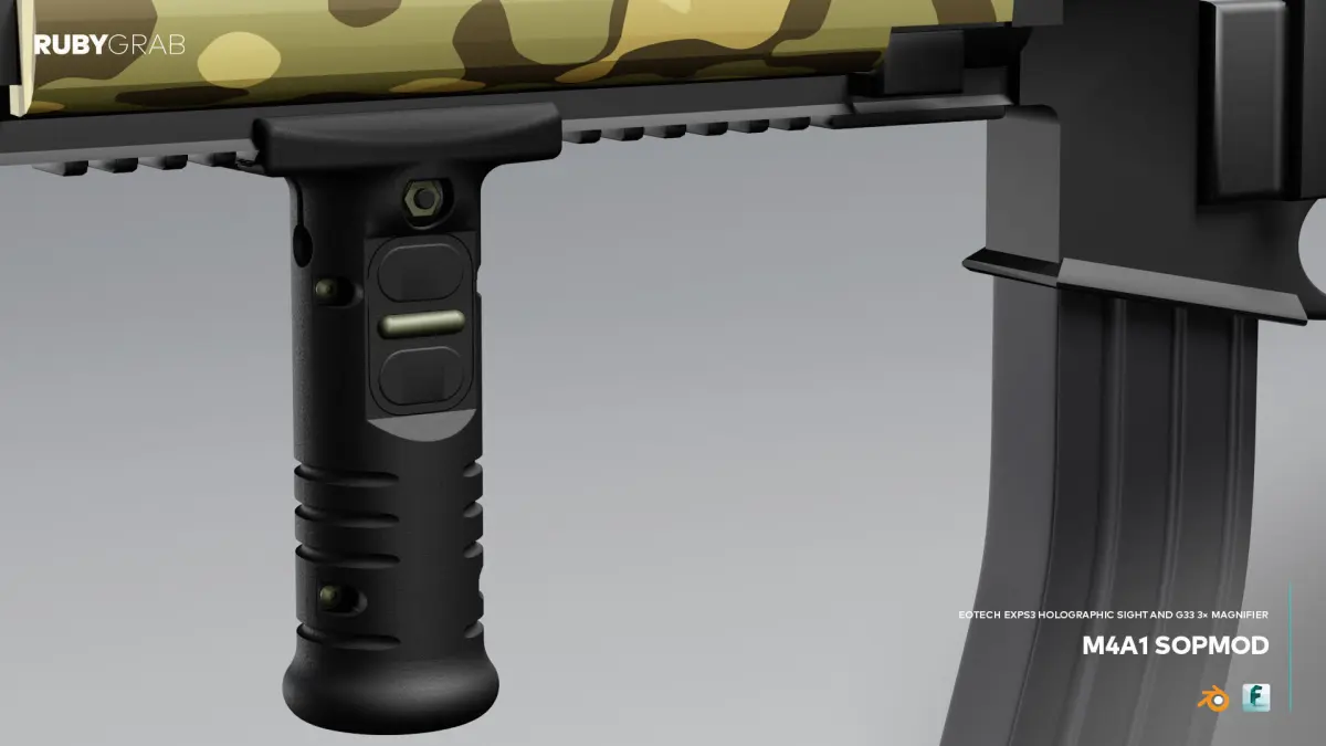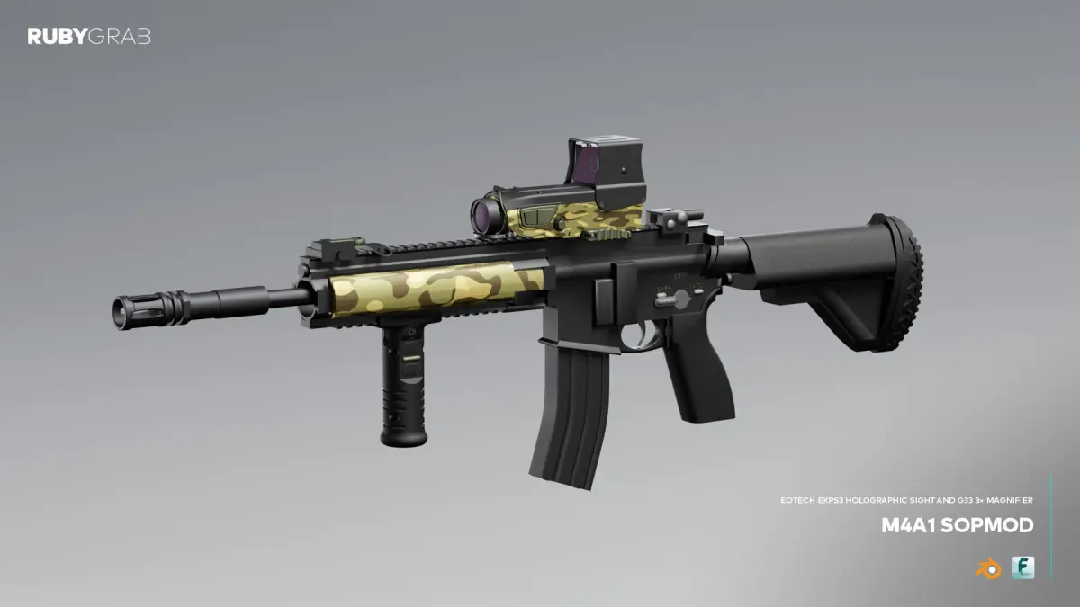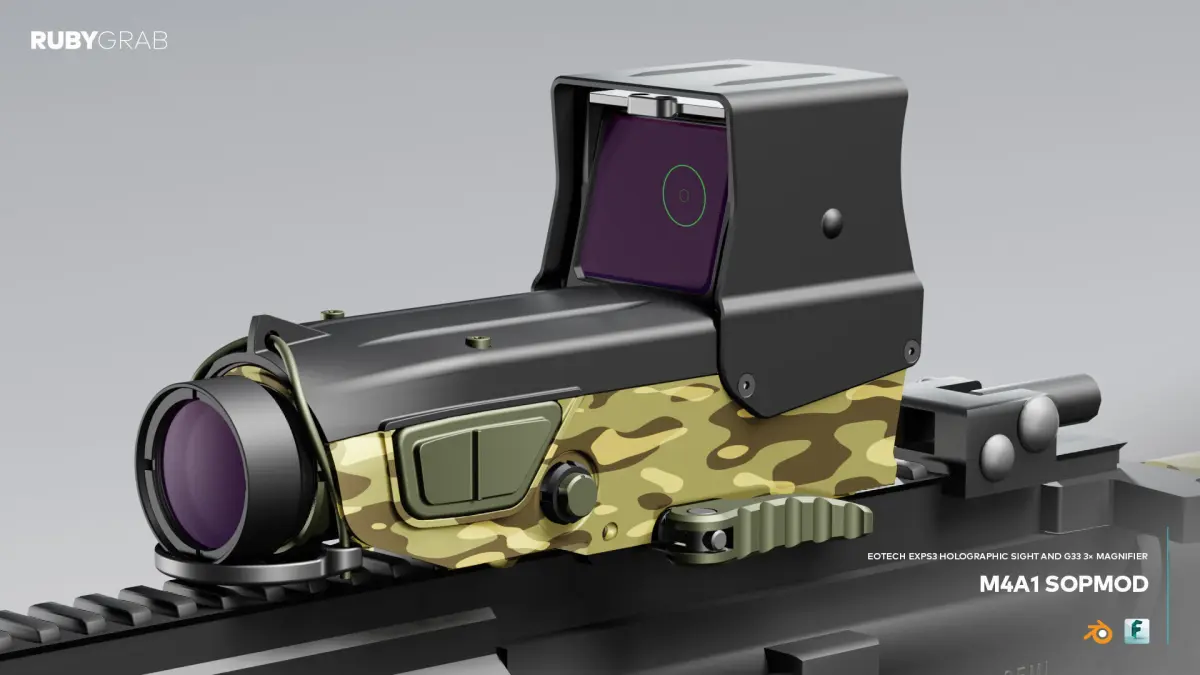 This is a detailed 3D visualization of the M4A1 SOPMOD carbine equipped with an EOTech EXPS3 holographic sight and G33 3× magnifier.
