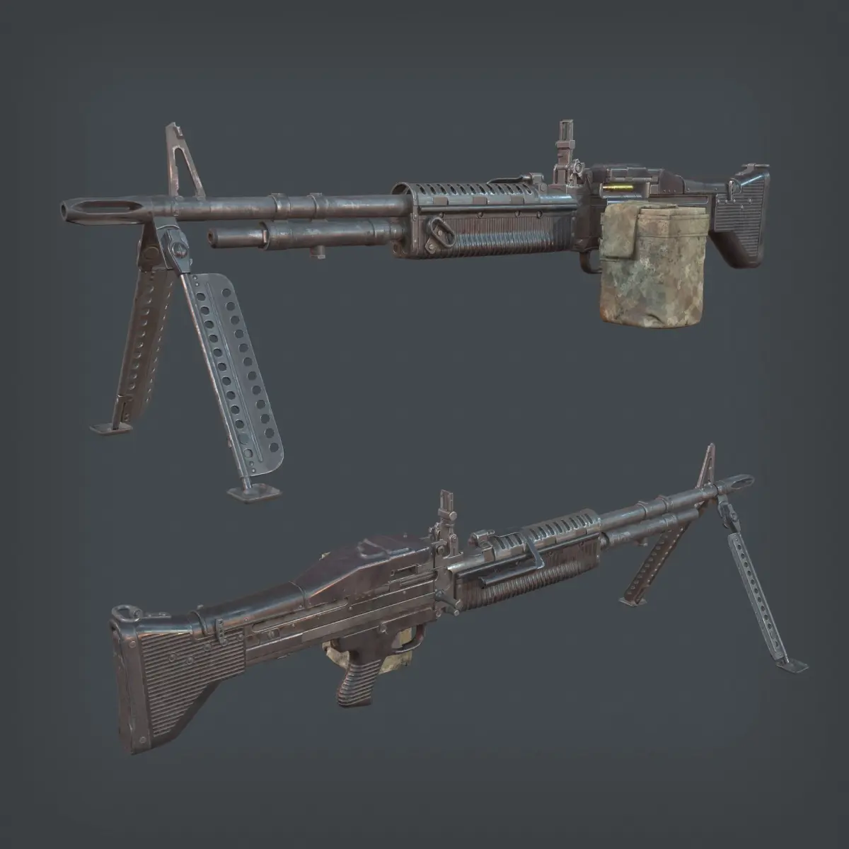 Here is a game-ready M60 machine gun, with PBR textures included in the files. This has 16696 polys (29654 tris) and 16229 vertices.