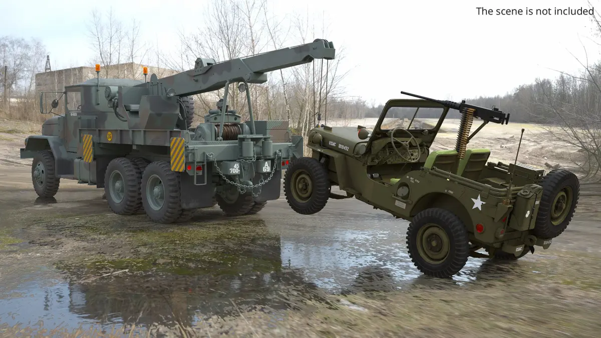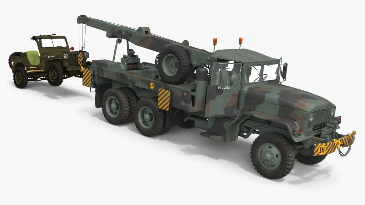 M62 Wrecker Recovery Crane with Towed Jeep M38 is a three-dimensional model of a military recovery truck equipped with a boom crane system and a classic Willys-type light utility vehicle in tow.