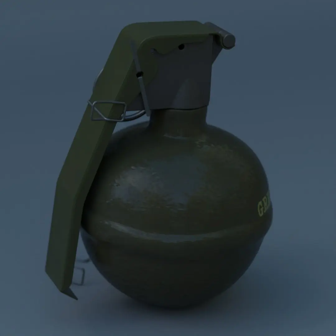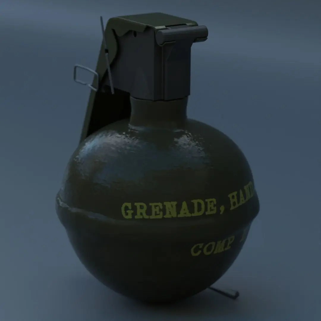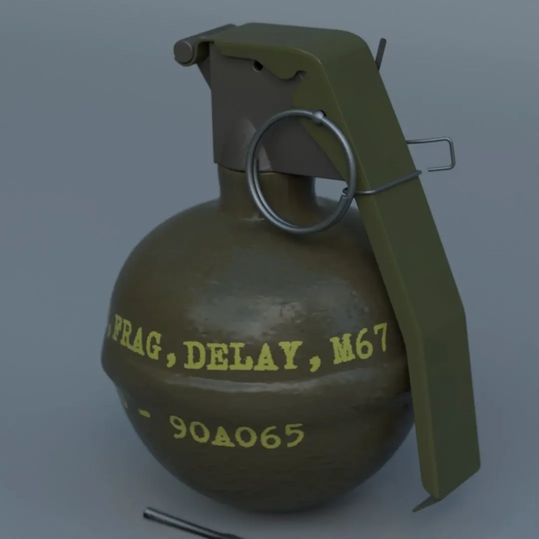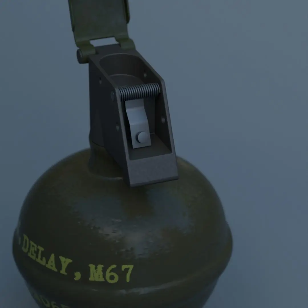 M67 fragmentation grenade. Very high polygon count, so it's really only usable for still renders. If you want to remesh it for usage in games, it's 100% allowed.The file contains an intact pin and a flattened one, that has been pulled out of the grenade. I have also included a safety pin that has been bent.