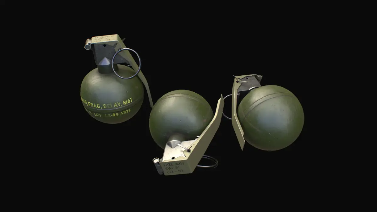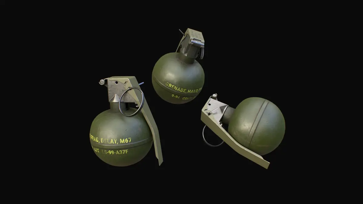 High quality low-poly model M67 grenade, with PBR textures in 4k, also including textures for Unity and UE5 game engines. Game ready model M67 for PBR game engines, renderers, first Person Shooters, VR games, and your other projects.