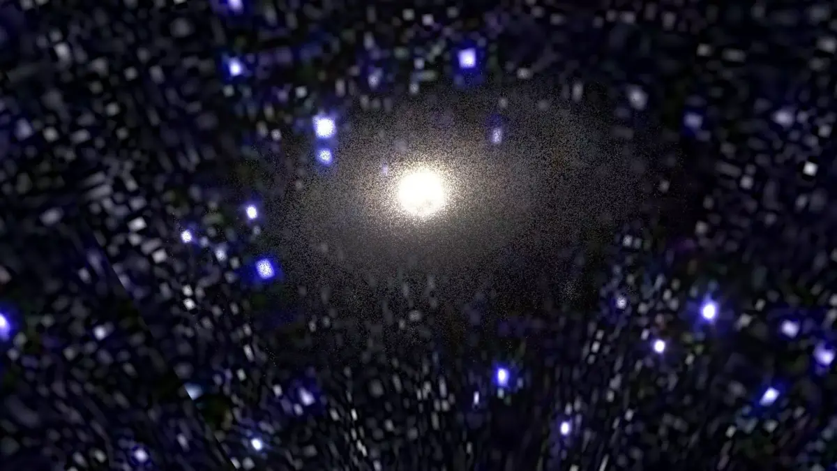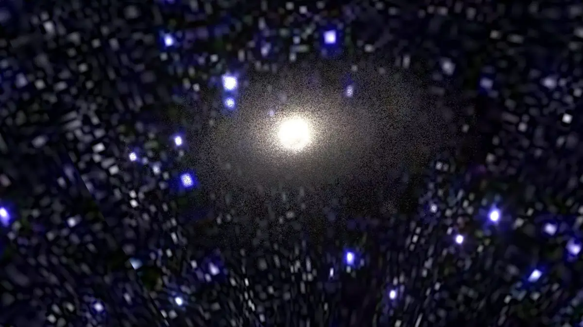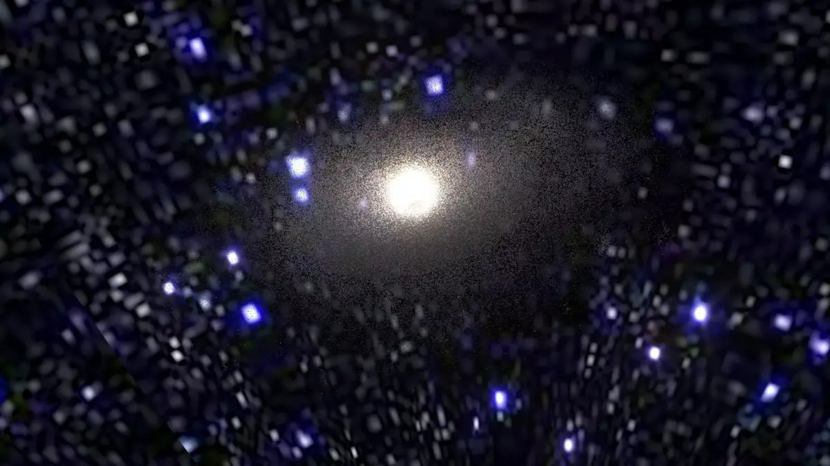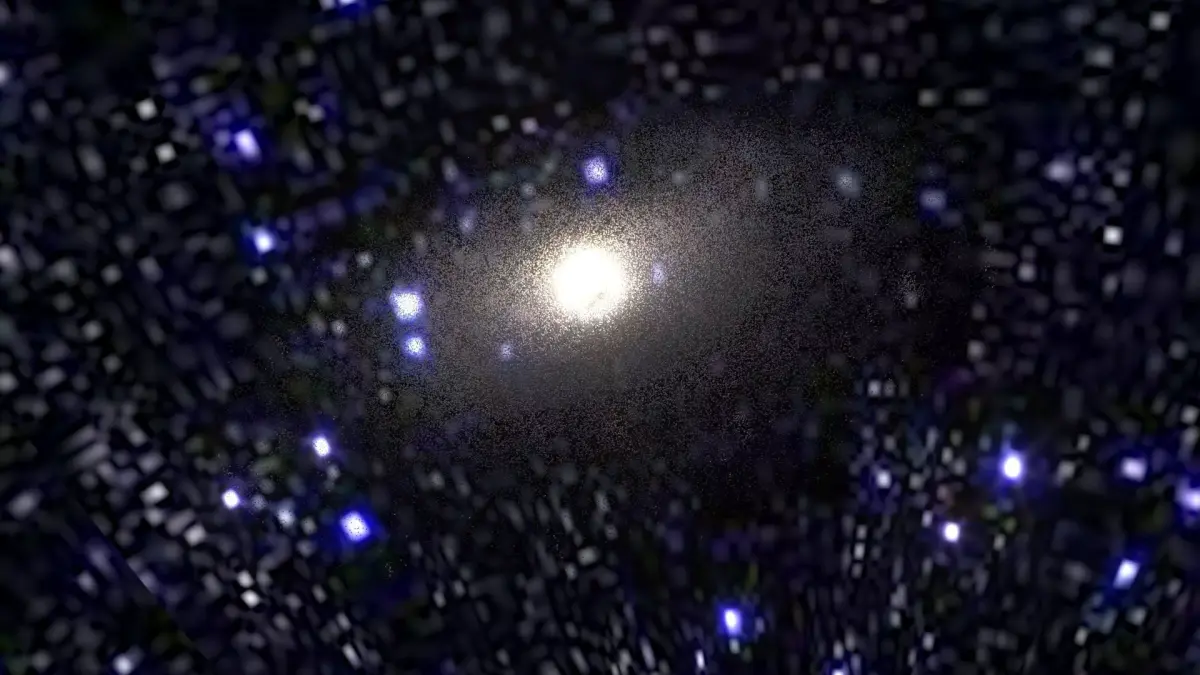 Model is a set of particle systems with elements of different types. Since real M83 Galaxy contains hundreds of billions stars, there are no way of simulate realistic view of galaxy directly. So here used textured particles with complex materials, placed along structural parts of Galaxy. Some of them are “clouds” of stars, others are light absorbing dust, emitting hydrogenous clouds, individual super-giant stars, etc. Multi-layered complex shaders was specifically designed to retain detailed and realistic view with extreme closeup and inside-the-galaxy views