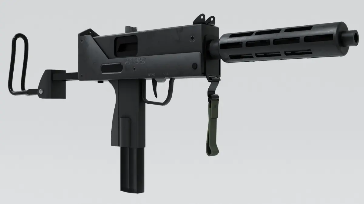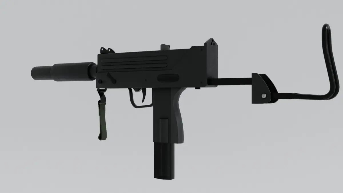 Model of the MAC-10 and three of its atachments barrel extender, silencer and carring strap, and a 9mm bullet.