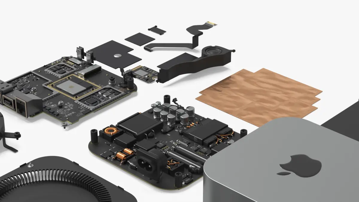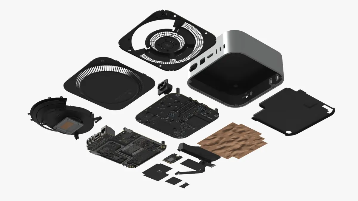 The Mac Mini M4 exploded set shows internal parts such as the processor, memory modules, cooling system, and storage devices in a detailed layout. It provides a visual understanding of computer assembly and hardware design for this compact desktop model.