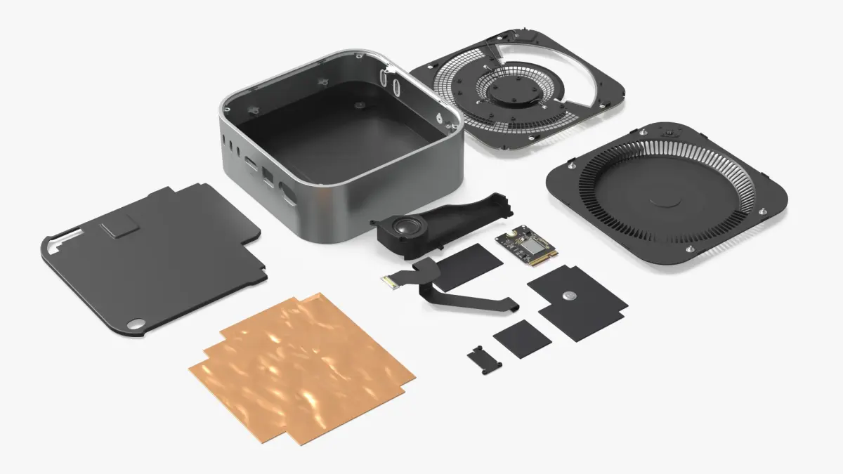 Mac Mini M4 Exploded Computer Hardware Silver is a three-dimensional model of set of disassembled and demounted computer components.
