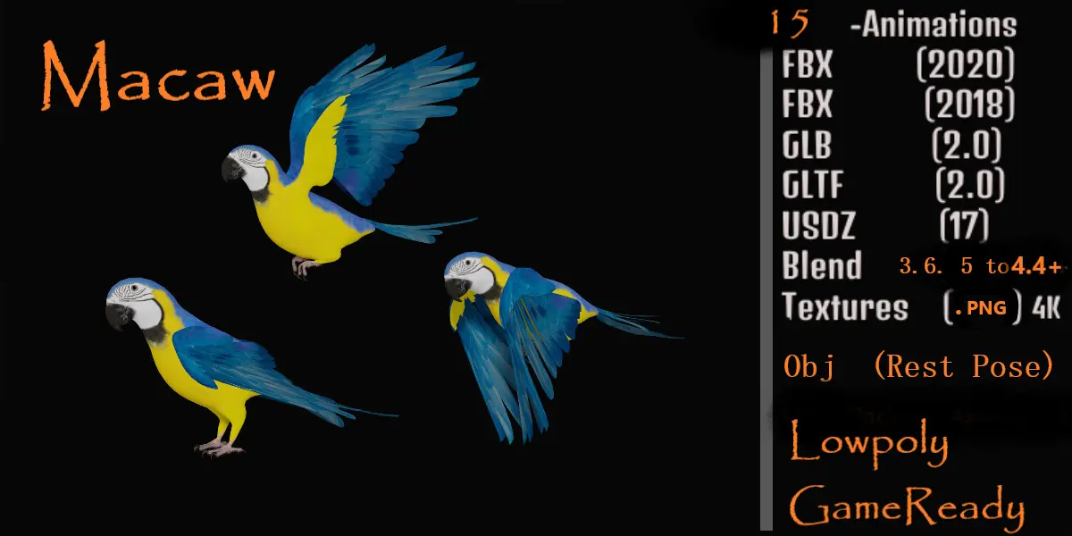 Macaws are a group of New World parrots that are long-tailed and often colorful, in the tribe Arini. They are popular in aviculture or as companion parrots, although there are conservation concerns about several species in the wild..3D Macaw companion parrots Animal Model By Nyilonelycompany (nyc).