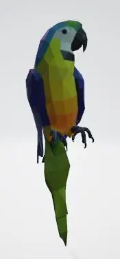 A low-poly 3D model of a macaw, featuring vibrant, simplified geometric shapes to capture the bird's iconic colorful plumage and sleek form. Ideal for games, animations, or minimalist art projects, this model balances detail and performance with a clean, stylized design.