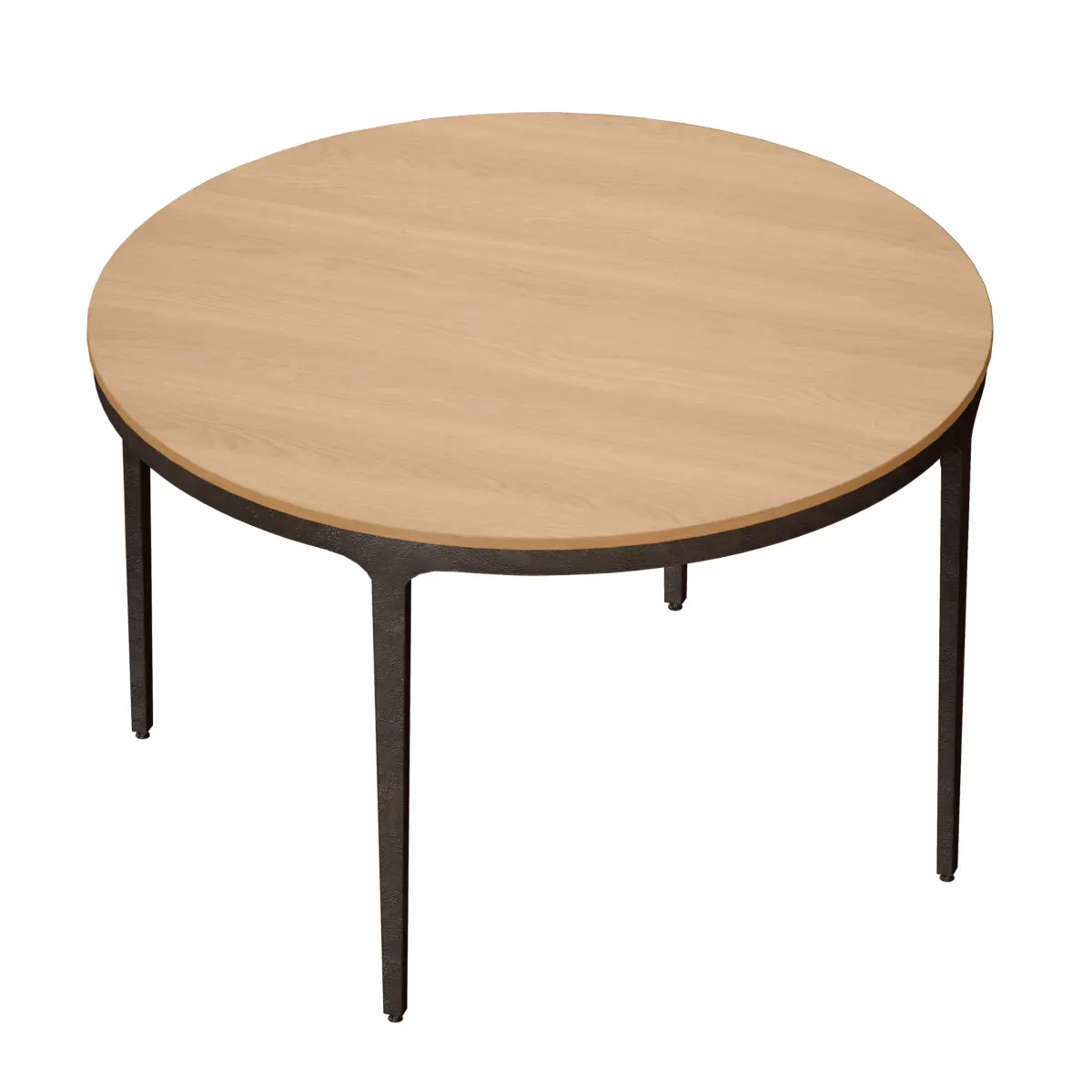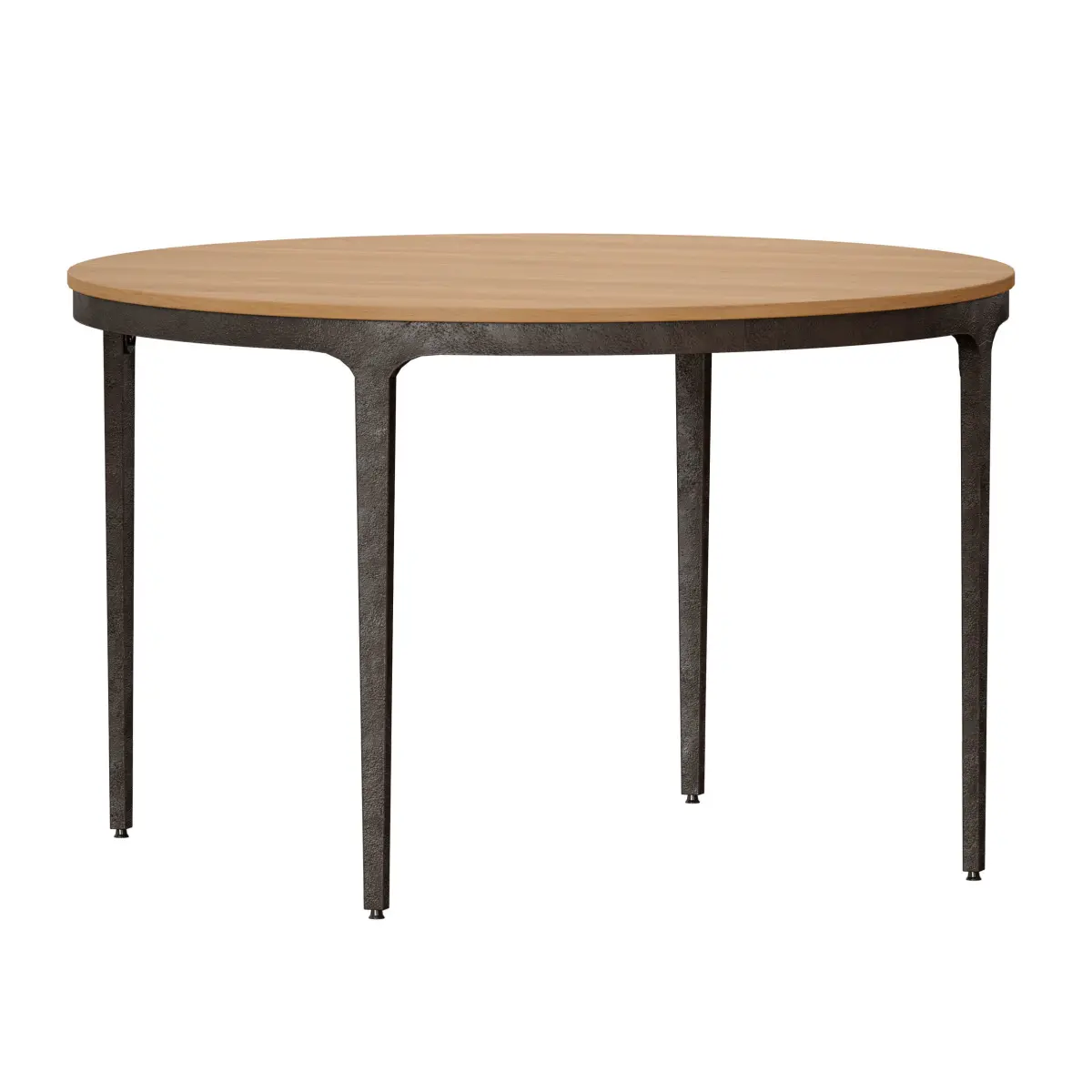Seller Description:The Maceo dining table balances graceful arcs and industrial strength. Sharply defined iron legs with a gunmetal finish curve to meet the round frame, setting off the lightly brushed solid wood top. With its timeless beauty, the table pairs well with a variety of chairs styles and easily goes from casual to chic.Width: 48 Depth: 48 Height: 30 "