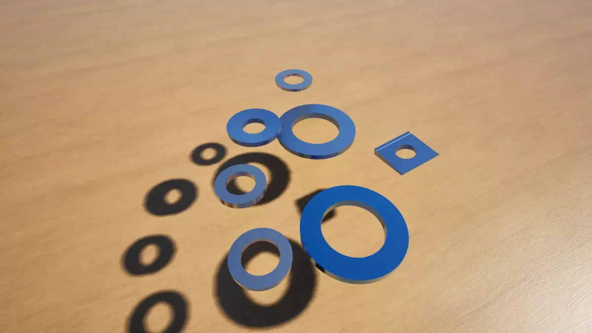 A set of precisely modeled industrial washers designed for mechanical assemblies, engineering visualizations, and realistic PBR environments. Each washer features accurate dimensions, clean topology, and optimized low‑poly geometry, making the models suitable for real‑time engines such as Unity, Unreal Engine, and all major DCC tools.