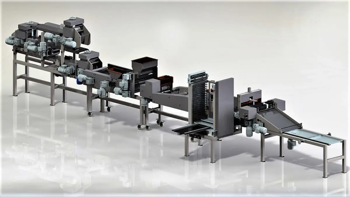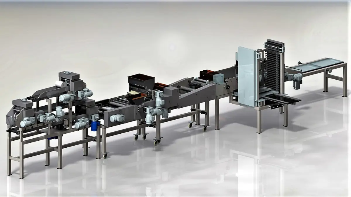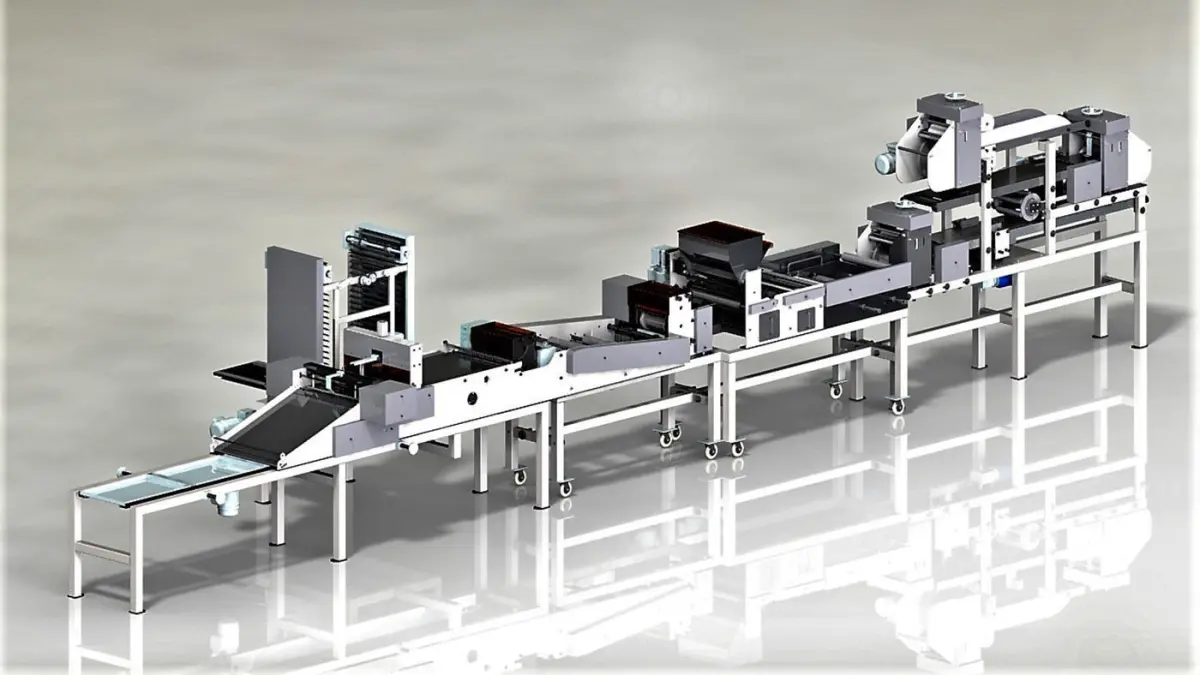 The line is made up of four machines.1.Laminat, for preparation of a test on a width of 180mm and thickness from 1 to 20 mm.2.Knife for longitudinal cutting on strips of width from 8 to 50 mm.3.Bath for dipping the dough strip and sprinkling with salt or sesame ...