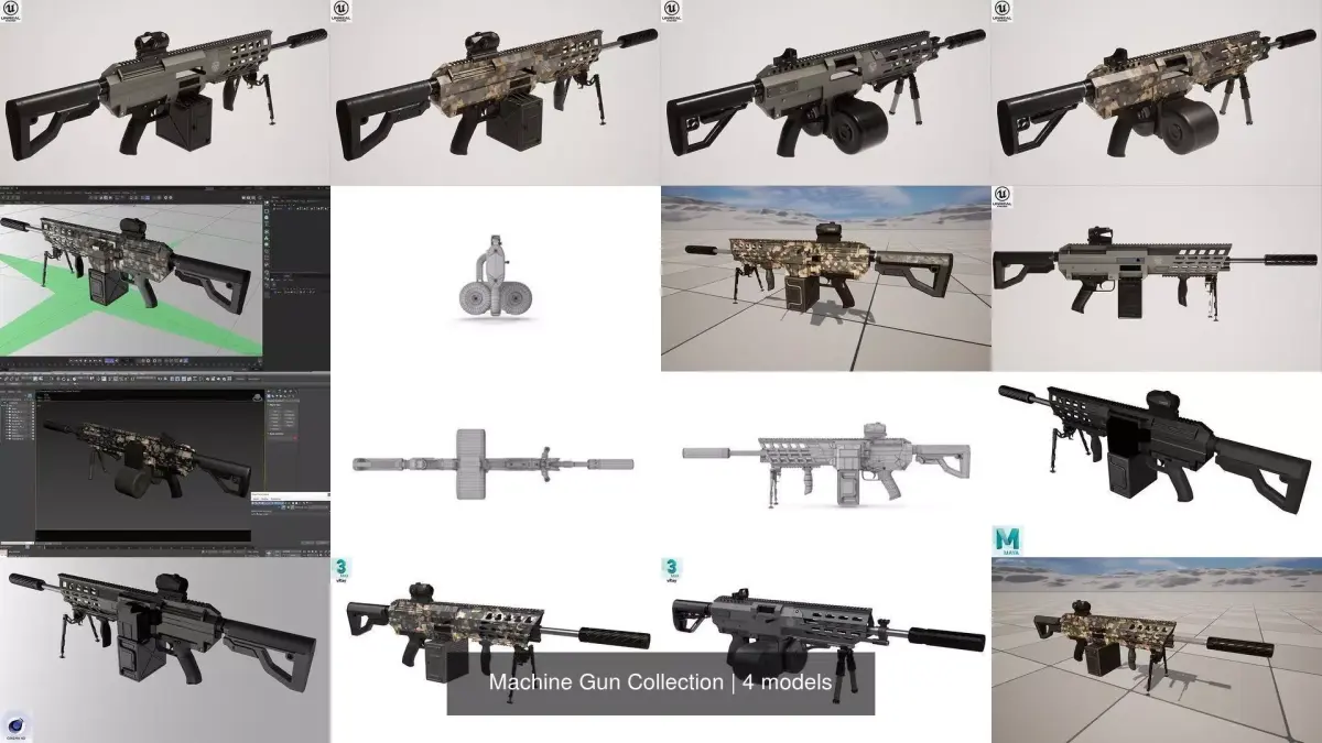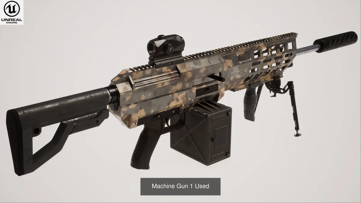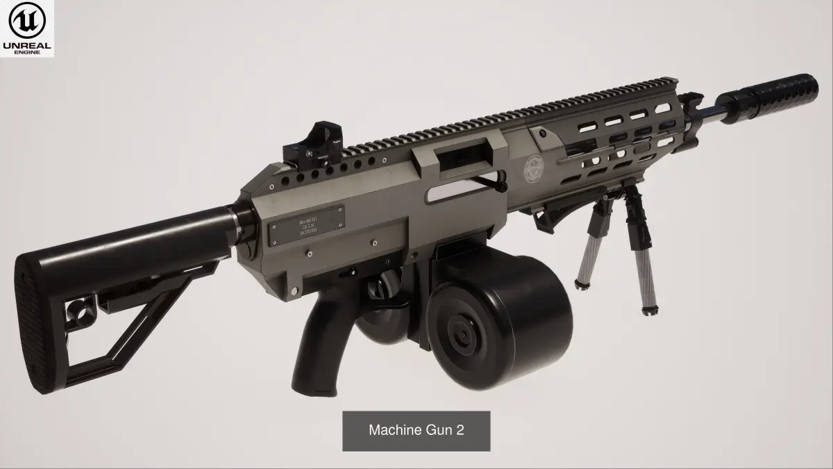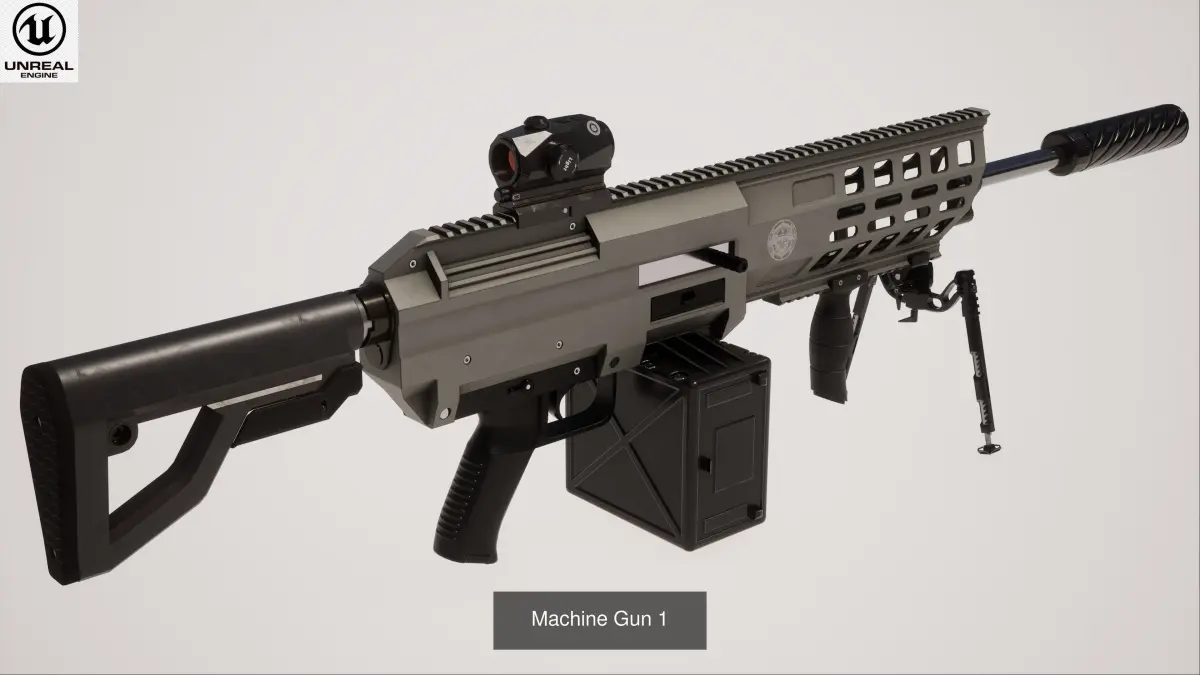 This Machine Gun Collection is a high quality, photo real model that will enhance detail and realism to any of your rendering projects. File units - cm. The model has a fully textured, detailed design that allows for close-up renders, and was originally modeled in 3ds Max 2021 and rendered with Unreal Engine 5 and V-Ray.