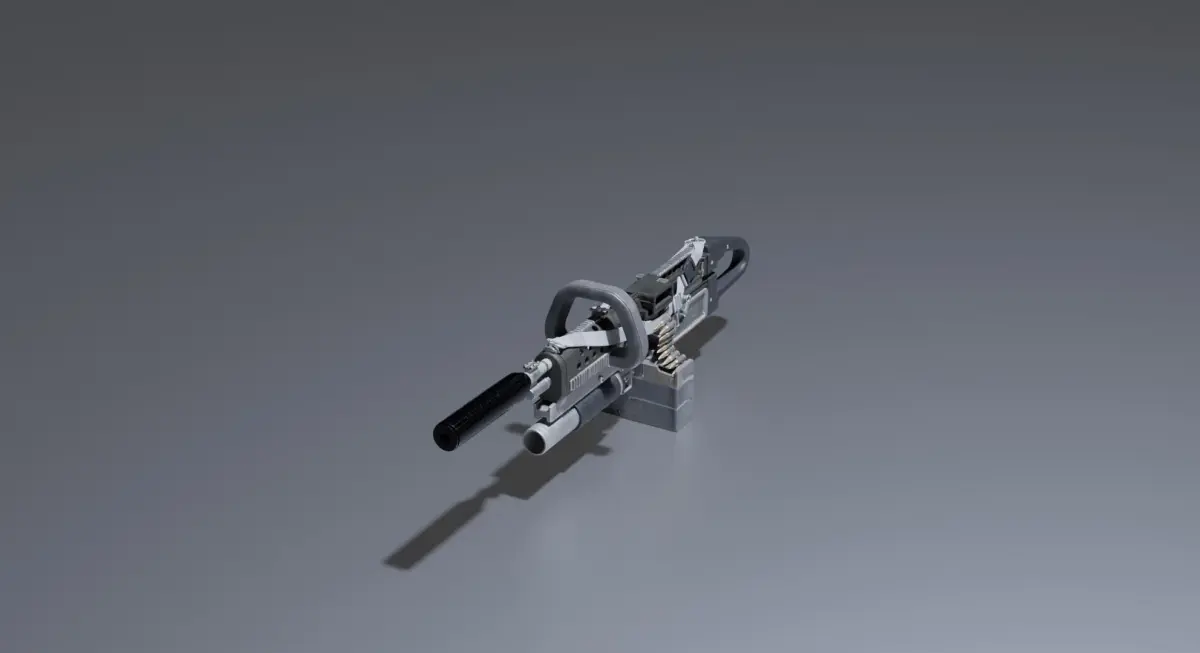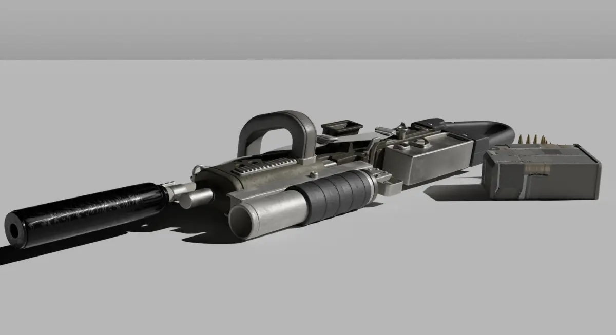 A 3D model of a machine gun would typically include the following components: