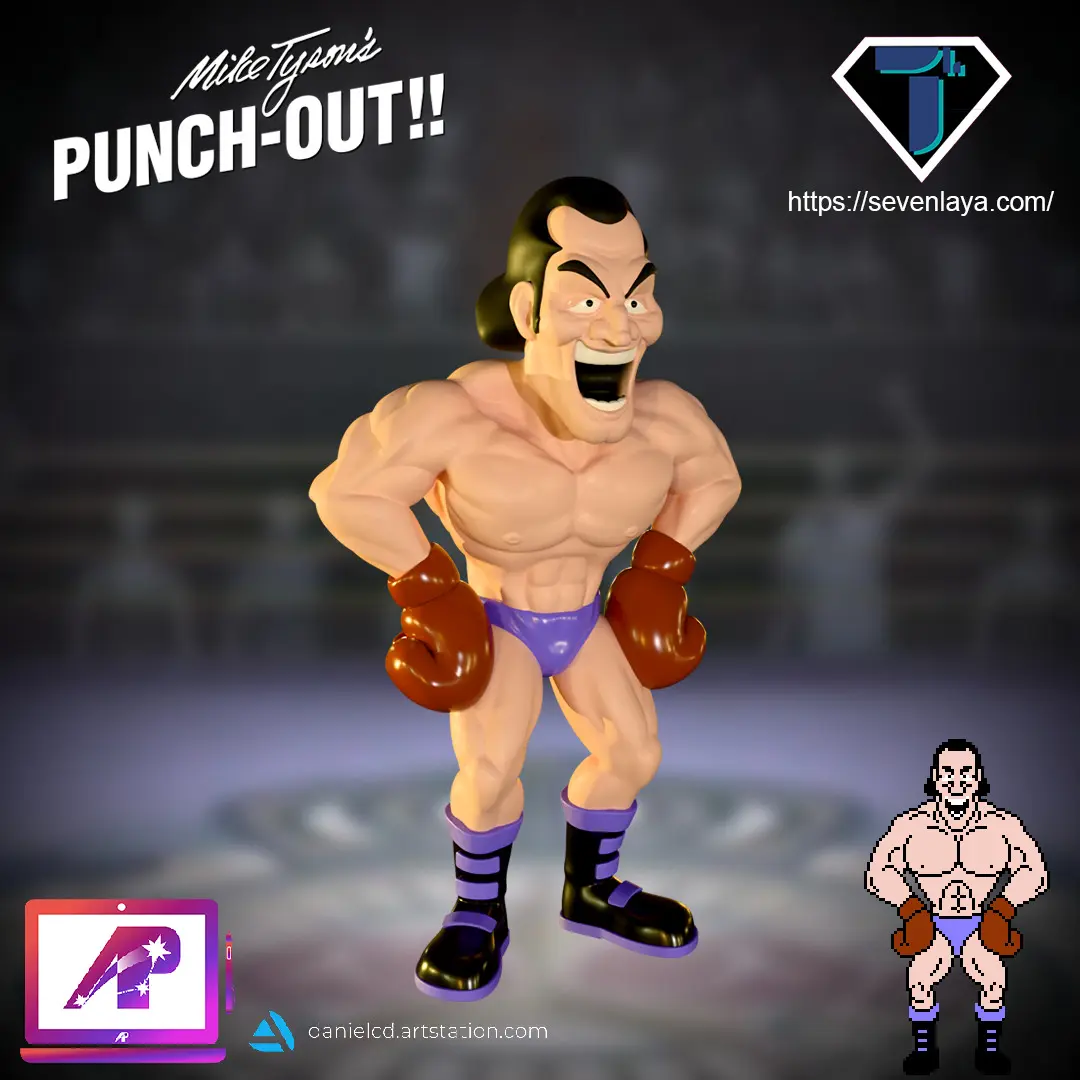 His offense is similar to that of Soda Popinski (given that in most his 2D appearances he was in, he was a palette swap of Soda Popinski) with big uppercuts and hooks, except he has his own attack, the clothesline. He utilizes two versions of this punch; for the first one he simply spins around 360 degrees with his arms outstretched and throws a quick haymaker at Little Mac. The second is a stronger one that occurs once he gets up from being knocked down; this time he moves back a bit and then keeps spinning around seemingly until Mac can no longer dodge. Like the Bull Charge of Bald Bull, this one can also floor Mac in one strike.
