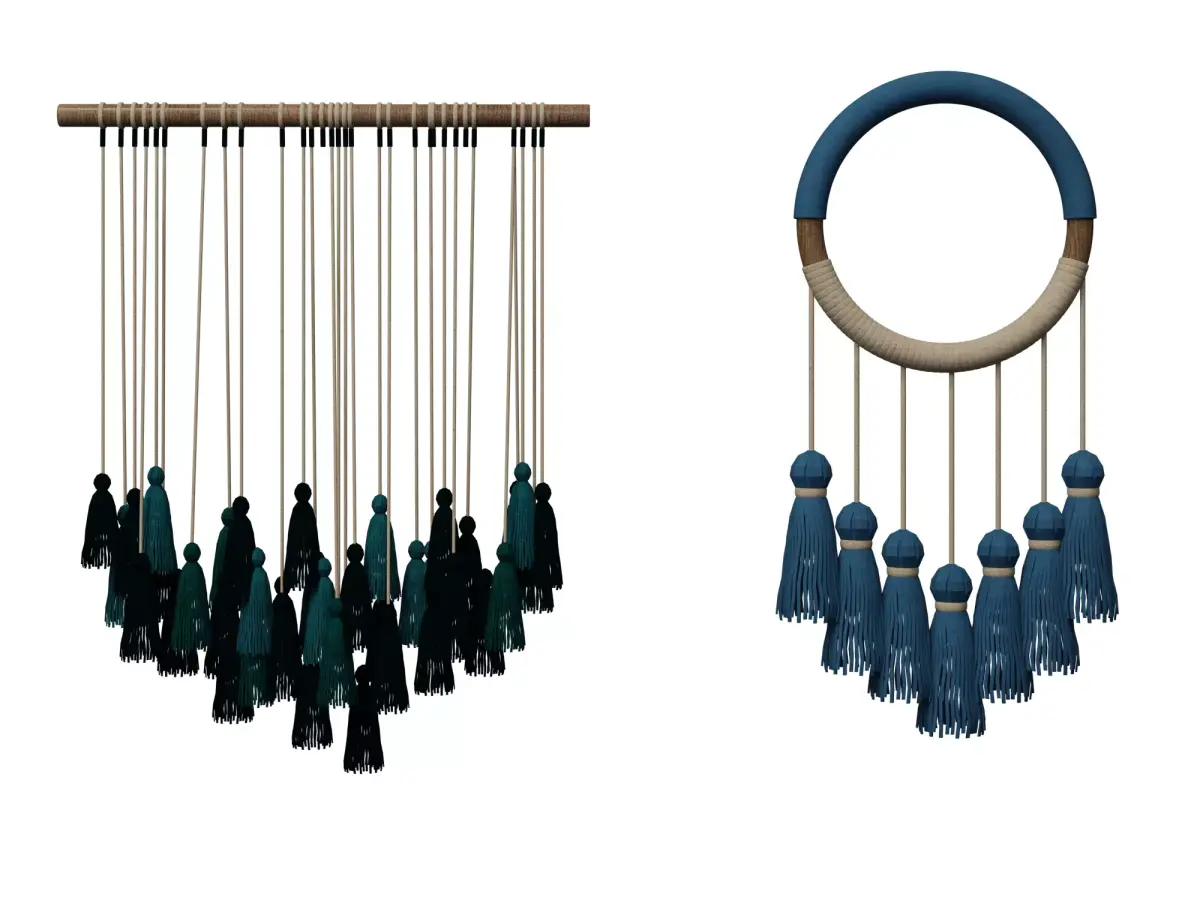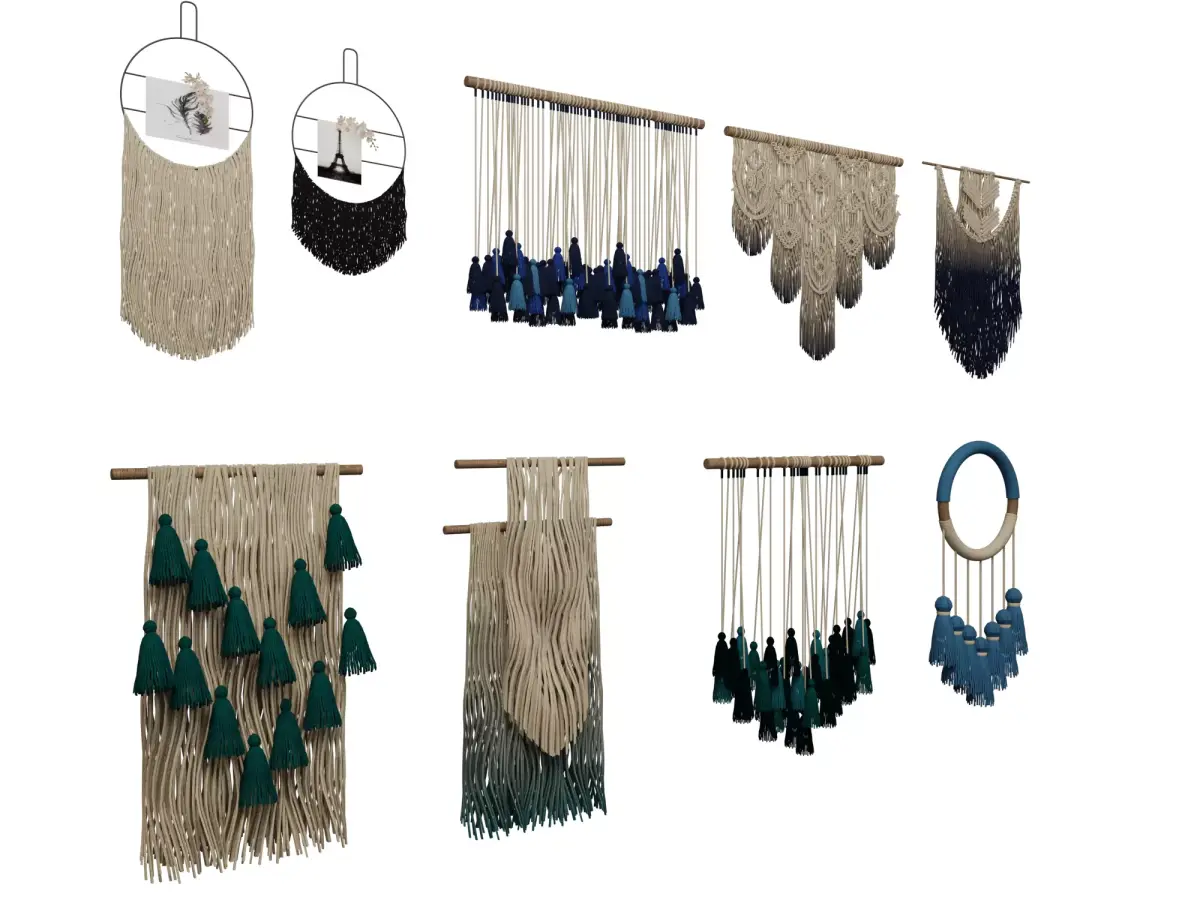 This is a high-quality Macrame Wall Decor Collection designed for interior renderings, boho-style rooms, home staging, and product visualization. The pack includes multiple handcrafted macrame variations with tassels, ropes, knots, and gradient fibers—perfect for adding natural, cozy and artistic details to any scene.