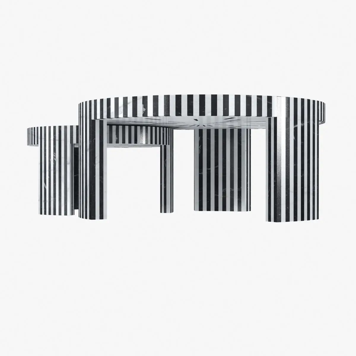 CARLOTTAMade of stone, this set of dramatic nestingcoffee tables is a statement that demandsattention. Exquisite craftsmanship pairedwith durable materials form a bold, circularpattern, atop three wide legs.MATERIALMarbleDIMENSIONSA. 14”Dia x 18”H25”Dia x 20”HB. 26”Dia x 15”H40”Dia x 18”H