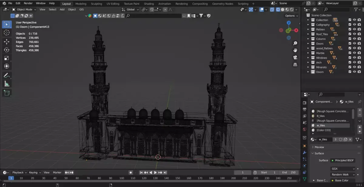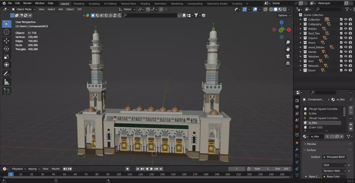 This is a highly detailed 3D model of Madina Mosque Entrance Gates Block-4, designed with traditional Islamic architectural patterns and intricate geometric details. The model features five small gates along with two large entrance gates, decorated with 3D Islamic calligraphy.
