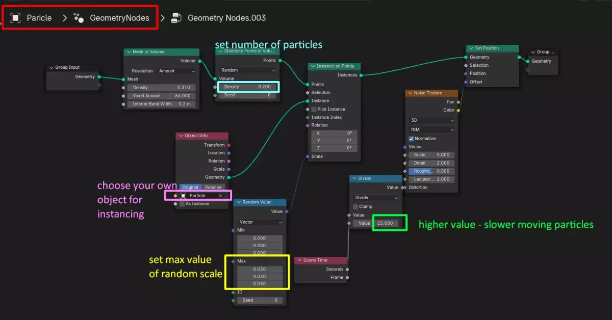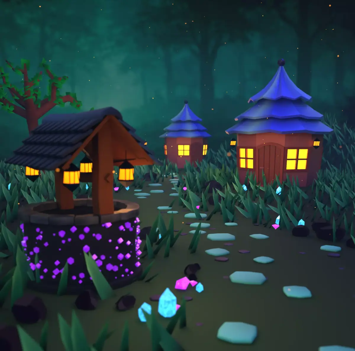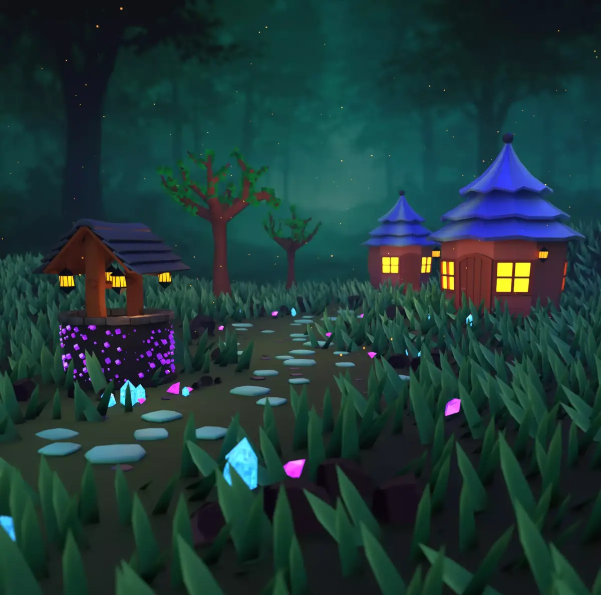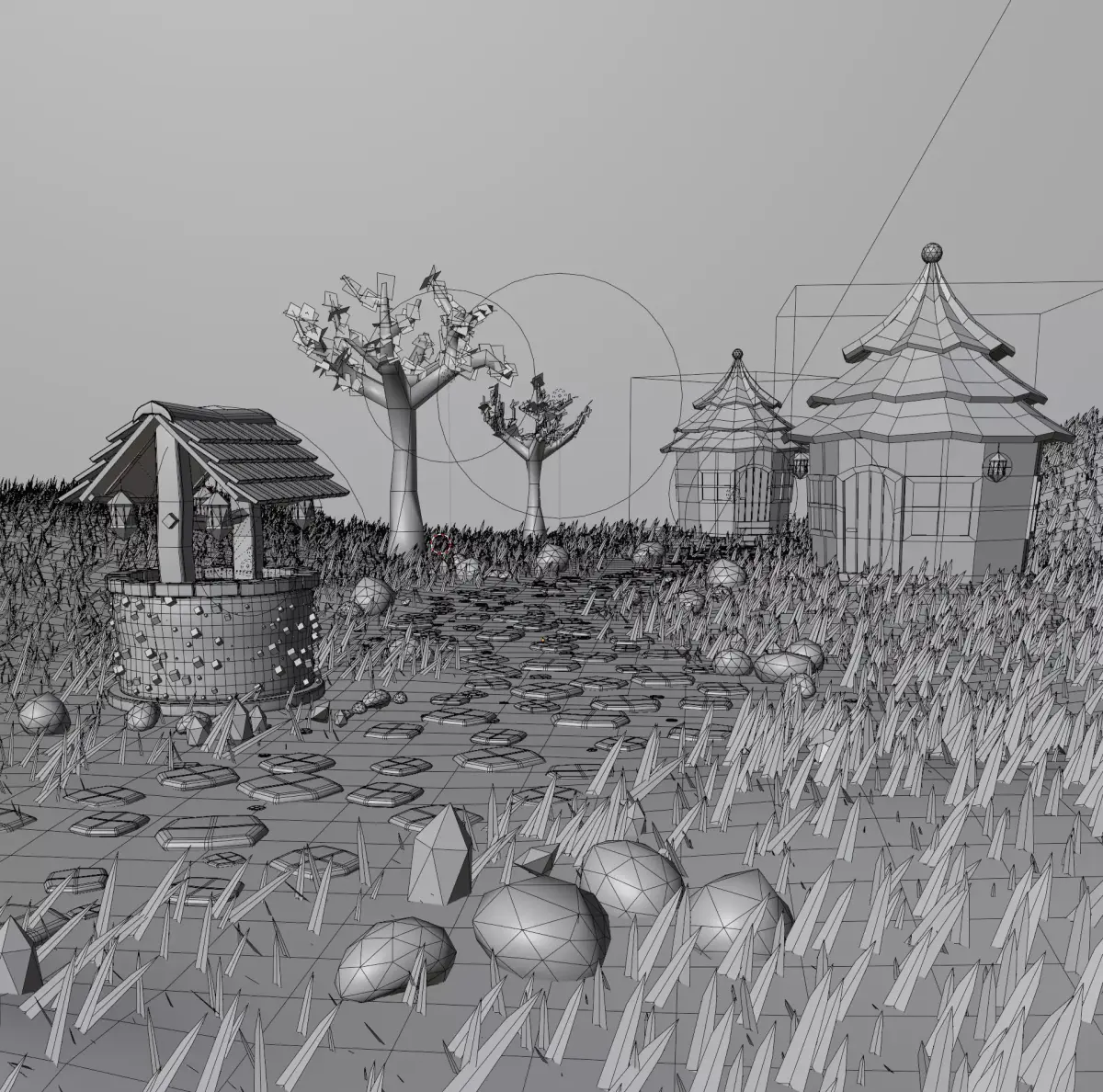 - Procedurally instanced grass, rocky path, and particles using Geometry Nodes - Adjustable quantity, scale, rotation, and distribution