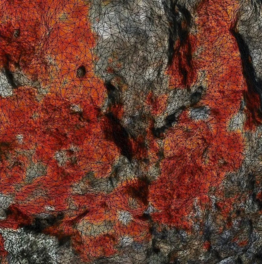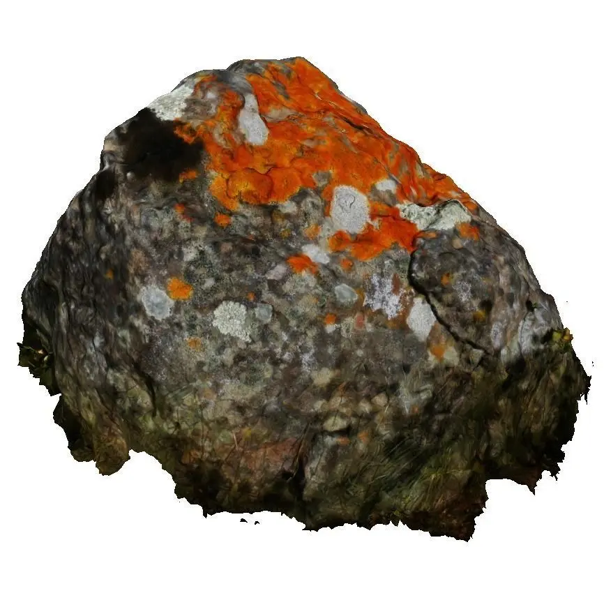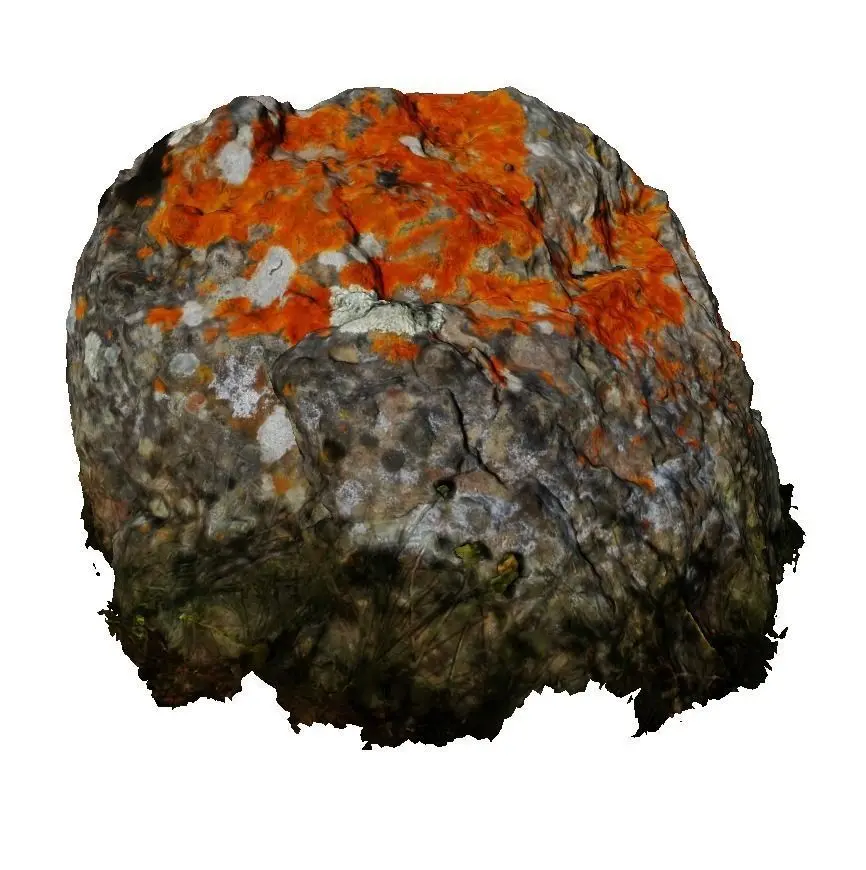 This is a 3D scan raw model of a magic volcanic stone populated with orange lichen.
