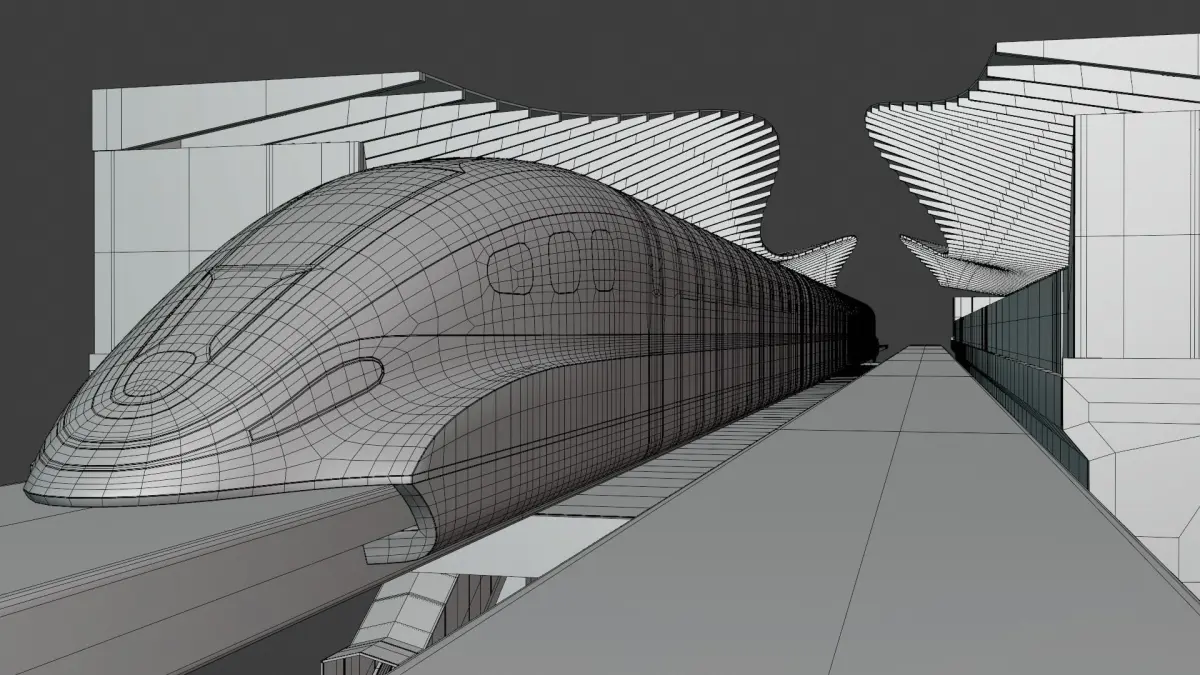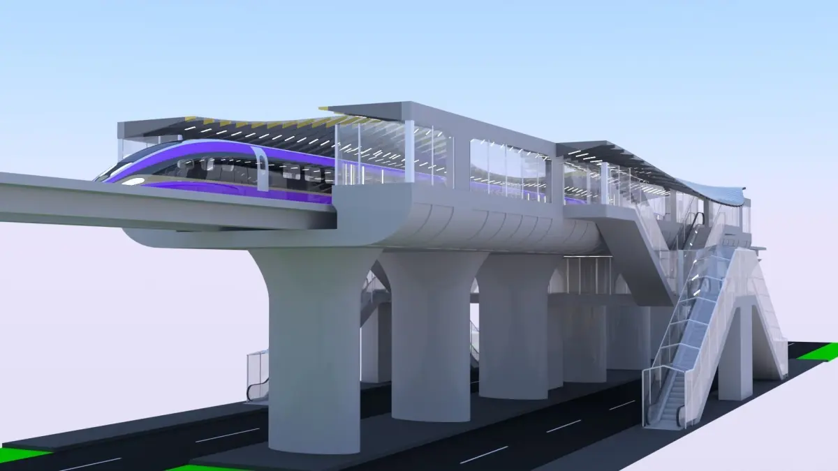 - This is 3D model of elevated maglev station with train.