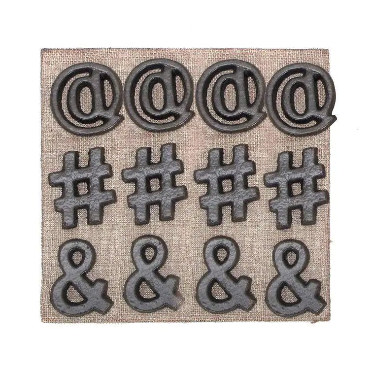 - Set of 12 cast iron magnetic symbols on burlap covered metal wall memo board.
