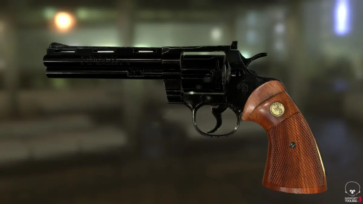 Magnum Colt Python ready for a game engine with PBR Textures it includes the .mb .obj .mb and the textures are 2048 x 2048 and are Normal Map, Roughness, Metallic and Roughness.