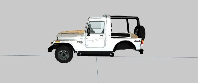 This is the model of the 2015 Mahindra Thar CRDe. It's one of the best offroad jeeps in India. Talking about changes, the 2015 Thar gets new front and rear bumpers, new headlamps with clear lenses, larger footsteps, and a slightly tilted canopy. On the inside, the SUV gets dual-tone (black-beige) treatment, 2-DIN music system, and 2-Pod instrument cluster. Adding to it, the SUV gets a new locking rear differential that will offer an extra push to the rear wheels of the car during off-roading.