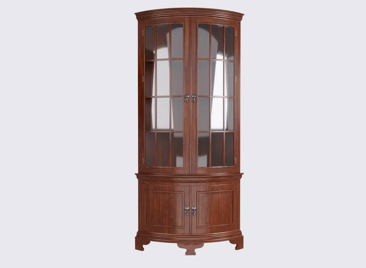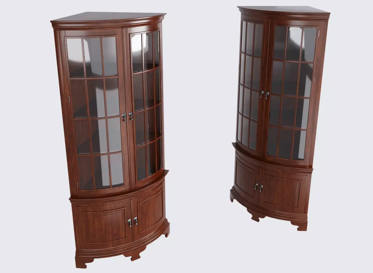 Description: 2 doors with individual panes of beveled glass (2 panes need to be re-set) - 2 keys - 2 door lower cabinet - top has 3 fixed interior wood shelves - 20thDimension: C - 40x 23 x 78.75"