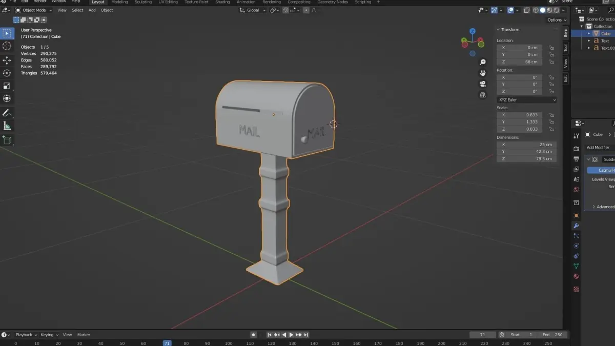 Metal mailbox model. The metal mailbox is 25cm wide, 80cm high and 42cm deep. It has a linear hole to leave an envelope on it and a flap that opens on the front. The main file format is .blend. Required file formats .dae, .fbx, .obj are loaded. As an example, images have also been uploaded. Thank you for the interest you have shown. Please do not forget to leave a like and comment. You can make a more economical purchase with the discount coupon in my profile.
