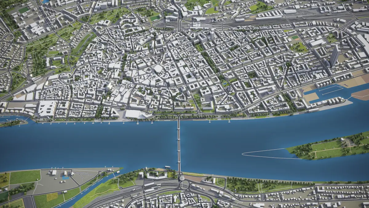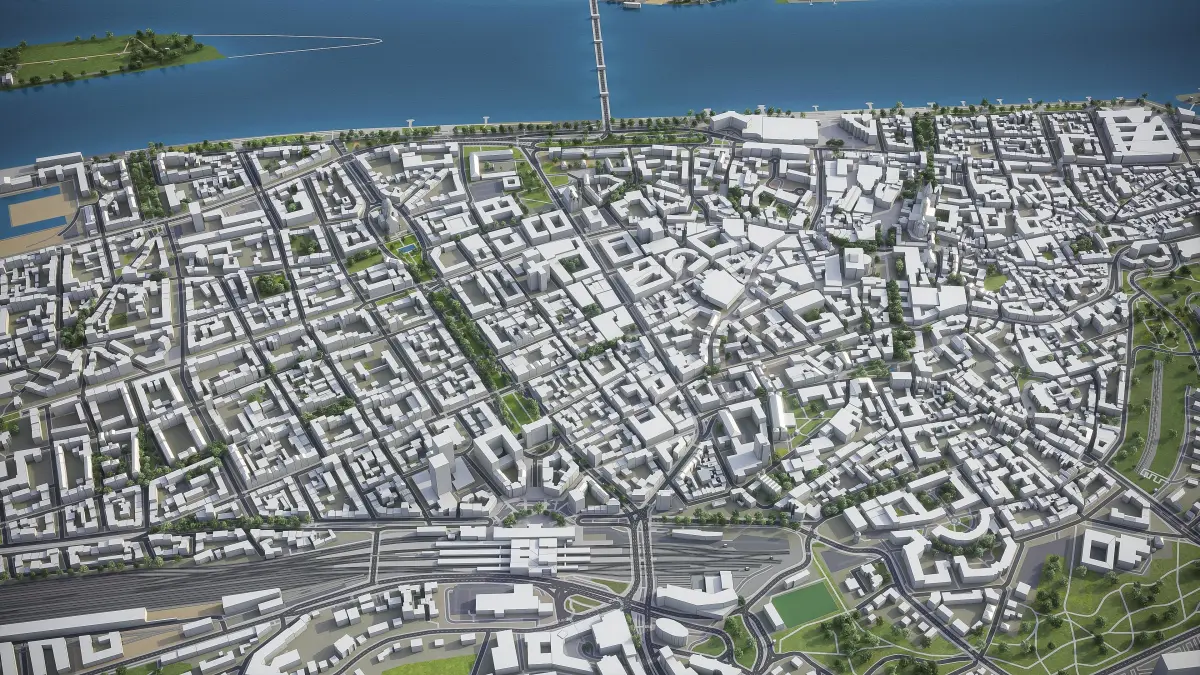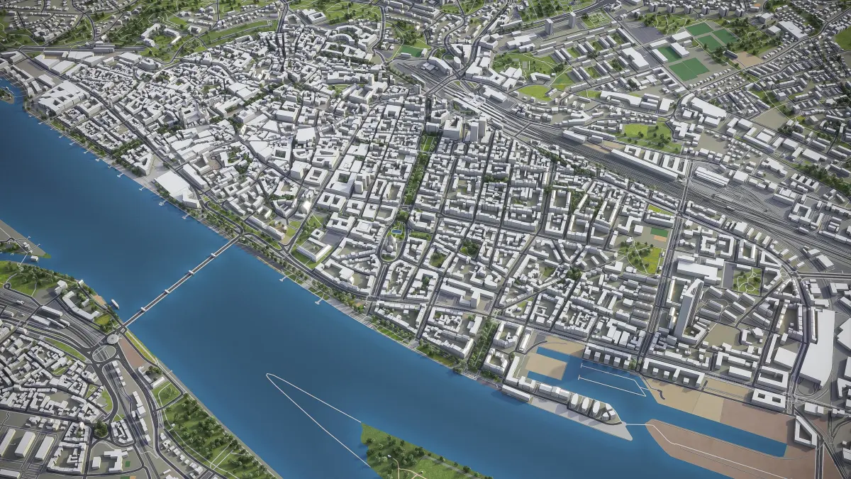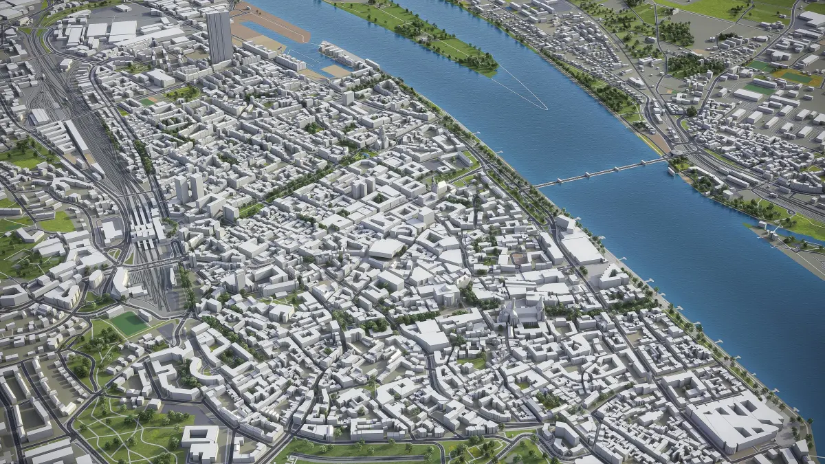 This is exact and accurate to scale 3D city model of Mainz - Wiesbaden, Germany and its surrounding area based on GIS data (February 2020)