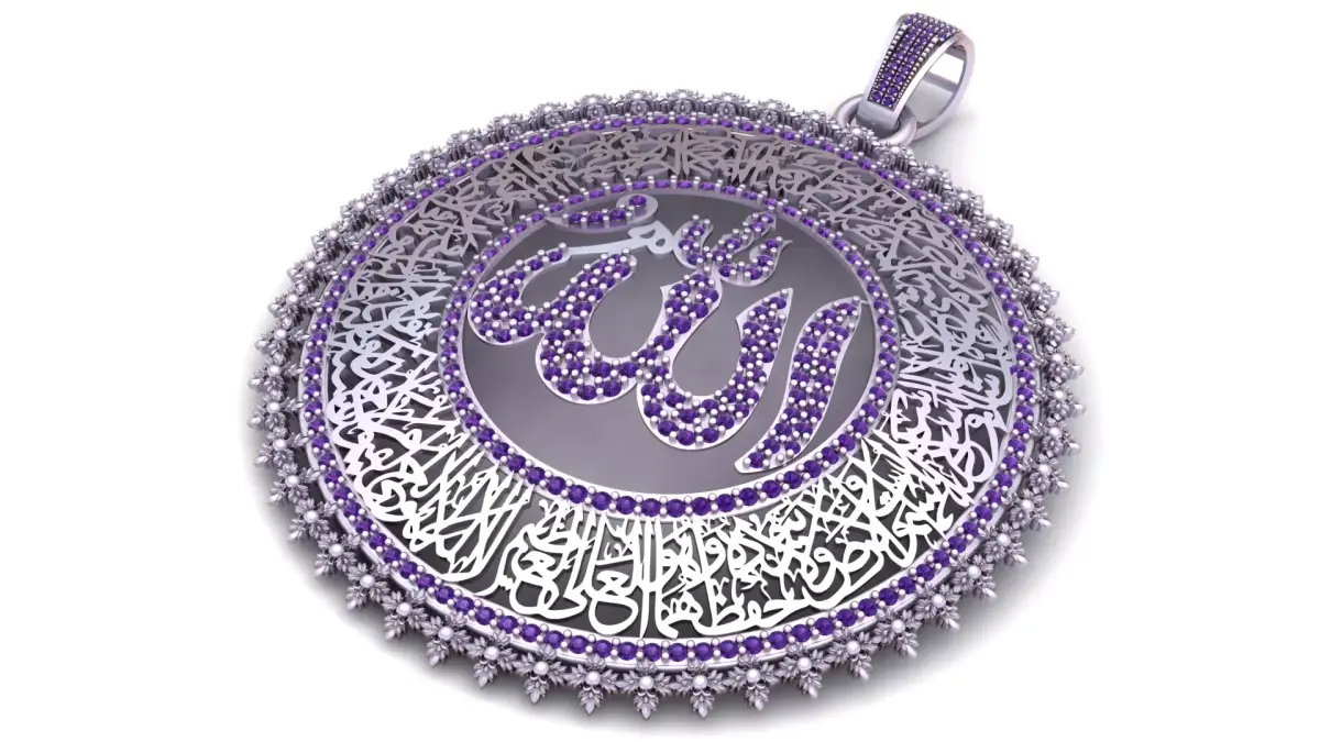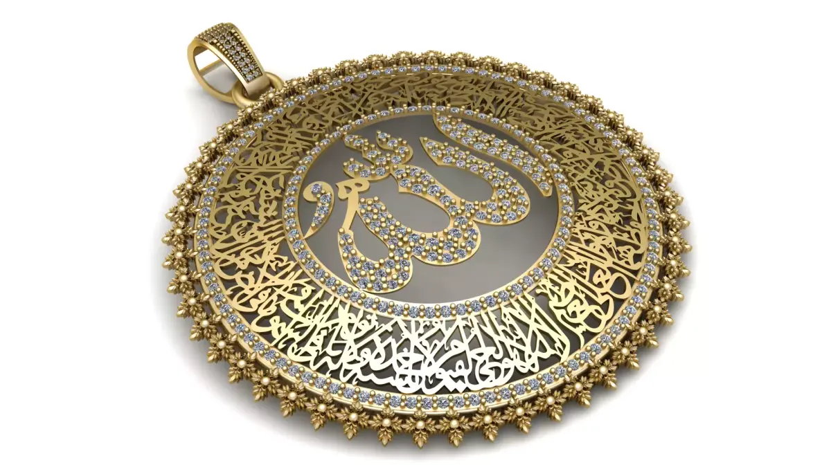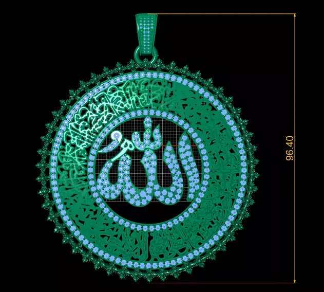 A highly detailed Islamic jewelry pendant featuring ornate Arabic calligraphy and a fully gem-set centerpiece spelling “Allah.” Designed for luxury metal casting with precision stone placement and intricate perimeter detailing.