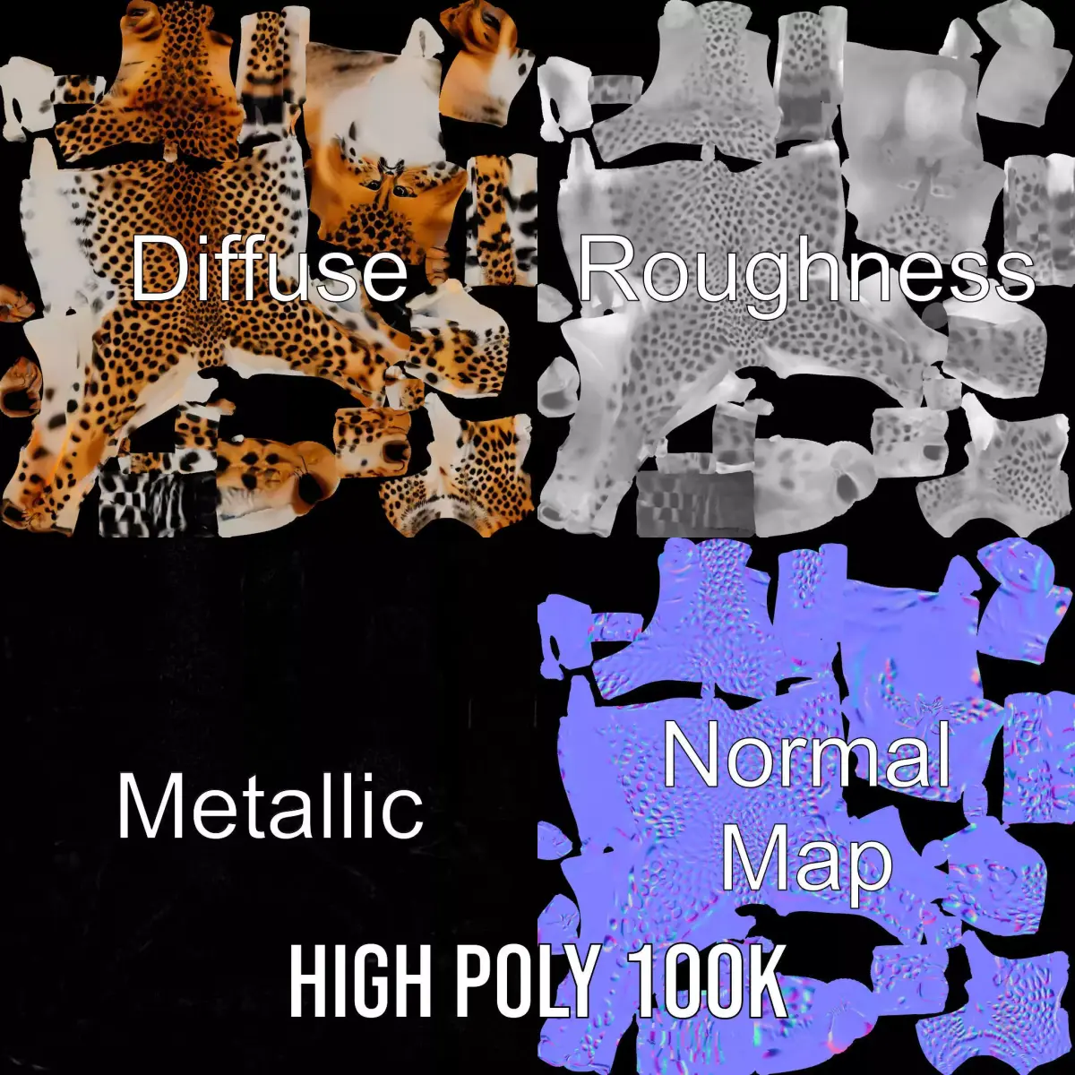 This realistic cheetah model is perfect for nature animations, educational projects, or wildlife simulations. Each model has 3 levels of detail: low-poly (1000 triangles for mobile), middle-poly (10,000 triangles for environment), and high-poly (100,000 triangles), which allows for the use of this model in production rendering (such as 3ds Max, Maya, Cinema4D, Blender, Vray/Corona/Cycles and all other), game engines (Unity and Unreal compatible), and interactive presentations, providing a choice of detail based on the LOD System principle. The model's textures are PBR, Diffuse, NormalMap, and reflection/roughness/metallic, which are suitable for any modern rendering engine. All models accurately unwrapped and have no overlapping UV. All textures are 4096*4096 in size. If you like this model, please leave a comment and a like.