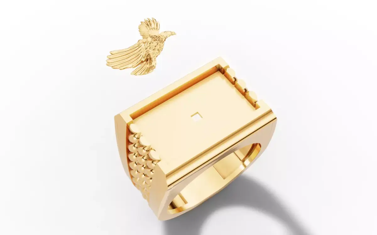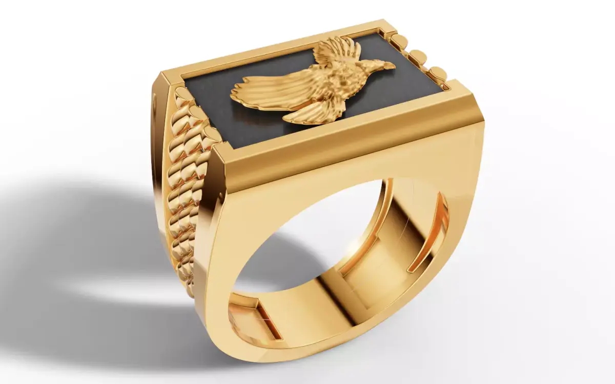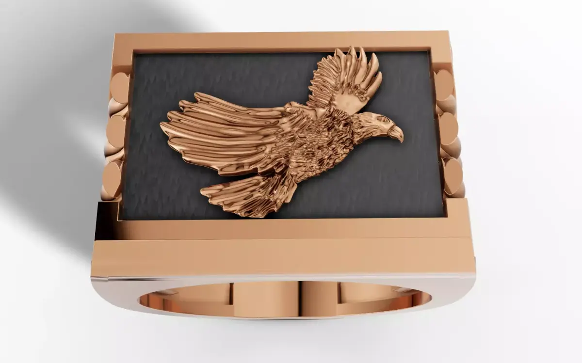 Ready-to-print CAD model for a heavy, high-luxury Eagle Signet Ring. This bold design features a highly detailed soaring eagle motif centered on a polished rectangular face. Symbolizing freedom, vision, and authority, the eagle is rendered in crisp high relief.