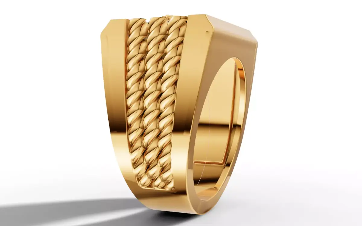 The substantial shank is accented with a triple-row braided rope texture on the shoulders, providing a refined and masculine texture. This solid metal design is optimized for high-fidelity casting in gold, silver, or platinum. Example weight in 14K Yellow Gold is a significant 23.50 grams. Files included: STL and 3DM.