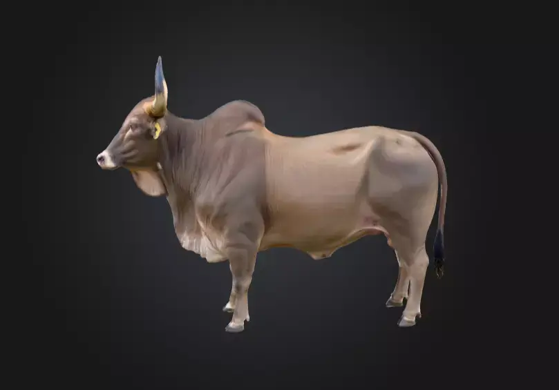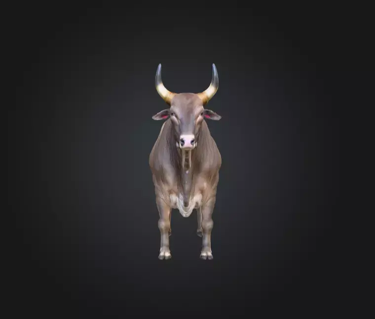 Every feature of this bull is expertly sculpted and textured to mirror the look and feel of a real animal. The muscular frame and sturdy posture communicate both raw power and calm endurance, while the broad chest, strong legs, and well-proportioned back reflect careful anatomical study. Its natural hide is rendered with subtle variations of brown and earthy hues, complete with fine hair detailing, soft highlights, and realistic skin folds. The prominent horns are polished and slightly curved, showing gentle gradients from creamy bone at the base to darker, weathered tips. Small but precise details—such as the delicate ear folds, moist muzzle, and carefully shaped hooves—create a model that feels alive even in still renders.