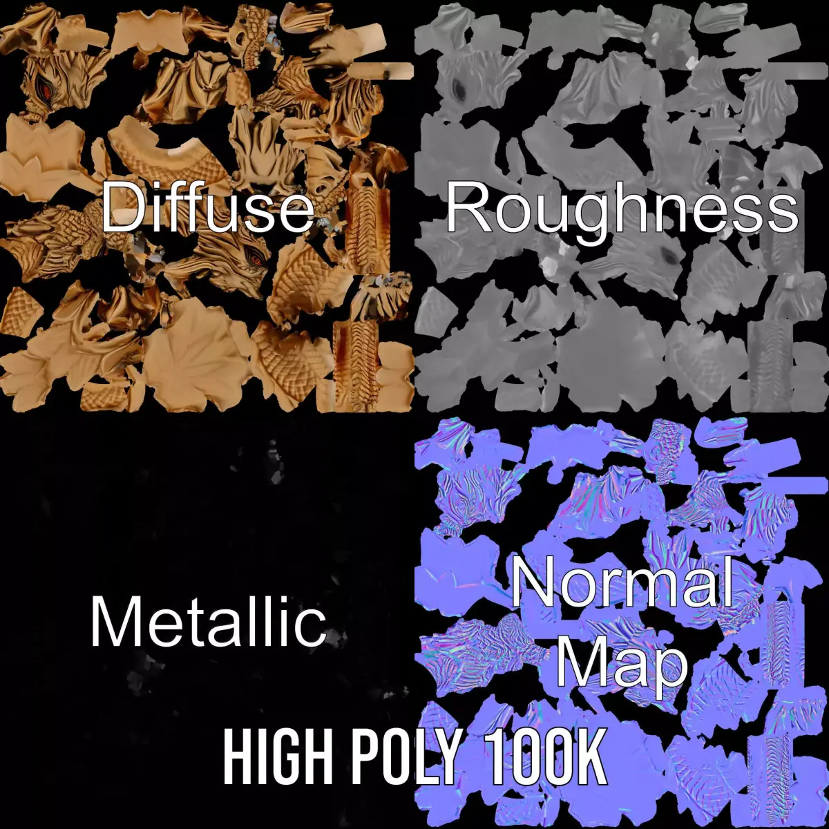 The Majestic Golden Dragon model pack features a strikingly detailed dragon head with intricate scales and horns, rendered in a luxurious golden hue. Ideal for fantasy settings, game assets, or decorative sculptures, each dragon model is crafted with precision. Each model has 3 levels of detail: low-poly (1000 triangles for mobile), middle-poly (10,000 triangles for environment), and high-poly (100,000 triangles), allowing for use in production rendering (such as 3ds Max, Maya, Cinema4D, Blender, Vray/Corona/Cycles, and all others), game engines (Unity and Unreal compatible), and interactive presentations, providing a choice of detail based on the LOD System principle. The model's textures include PBR, Diffuse, NormalMap, and reflection/roughness/metallic, suitable for any modern rendering engine. All models are accurately unwrapped with no overlapping UVs. The high-resolution textures are 4096*4096 in size, ensuring exceptional detail. If you enjoyed this model, please like and leave a comment!