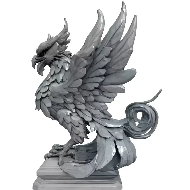 This highly detailed 3D model depicts a majestic Griffin perched upon a pedestal. Ideal for game development, architectural visualization, digital art, and 3D printing projects. This model is available in multiple formats including GLB, OBJ, STL, FBX, and PLY. Its intricate feather details and powerful pose make it a stunning centerpiece or decorative element. Optimized for static renderings and close-up shots, this Griffin model is not specifically designed for real-time applications. It features clean topology and is suitable for subdivision. The model is UV unwrapped and ready for texturing, making it easy to customize to your specific needs. The high-poly sculpt captures every detail of the Griffin's anatomy, from its sharp talons to its intricate wing feathers. While not low-poly, it offers exceptional detail for high-quality renders. This Griffin statue can be used in a variety of scenes, adding a touch of mythical grandeur to your projects.