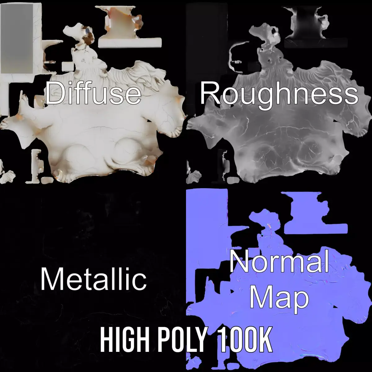 This Majestic Marble Lion model pack features a stunning sculpture crafted to mimic luxurious marble, showcasing intricate details and elegant design. Each model has 3 levels of detail: low-poly (1000 triangles for mobile), middle-poly (10,000 triangles for environment), and high-poly (100,000 triangles), which allows for the use of this model in production rendering (such as 3ds Max, Maya, Cinema 4D, Blender, Vray/Corona/Cycles and all others), game engines (Unity and Unreal compatible), and interactive presentations, providing a choice of detail based on the LOD System principle. This model is perfect for use in architectural visualizations, art installations, and creative animations. The model's textures are PBR, Diffuse, NormalMap, and reflection/roughness/metallic, which are suitable for any modern rendering engine. All models accurately unwrapped and have no overlapping UVs. All textures are 4096*4096 in size. Please like and leave a comment for the model if you enjoyed it.