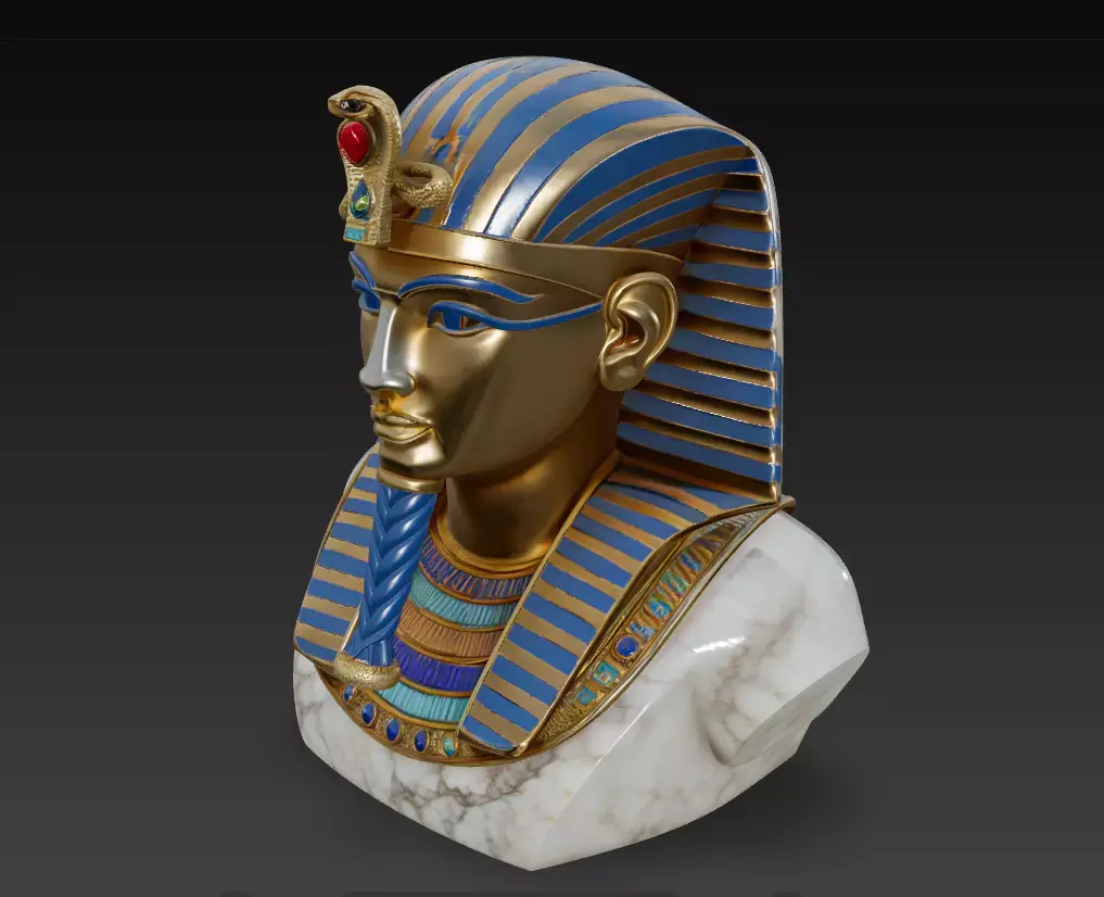 The Majestic Pharaoh Bust is a premium high-detail 3D sculpture inspired by the elegance and divine authority of ancient Egyptian royalty. This piece showcases a perfectly polished golden visage, deep blue lapis accents, and a meticulously sculpted ceremonial beard. The iconic striped headdress is crowned with a jeweled Uraeus cobra — symbolizing protection, divinity, and kingship.
