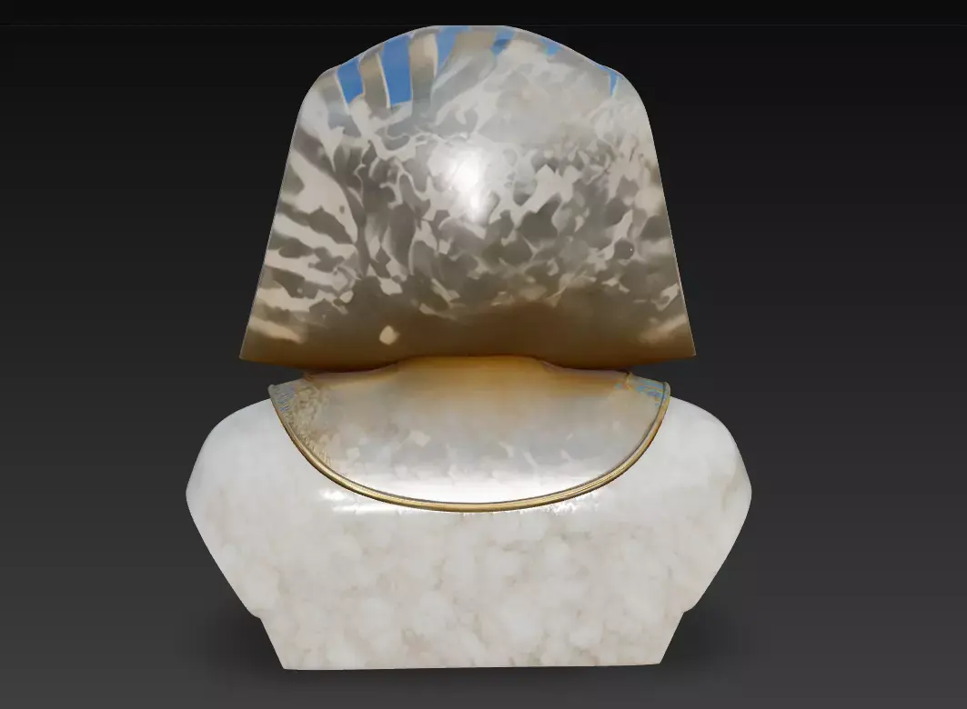 The layered collar features gemstone-like inlays and ornate textures, while the smooth marble pedestal anchors the statue with museum-quality presentation. Every curve, crease, and metallic highlight is crafted to deliver cinematic accuracy, making this model ideal for CGI scenes, collectibles, historical visualization, and high-end 3D printing.
