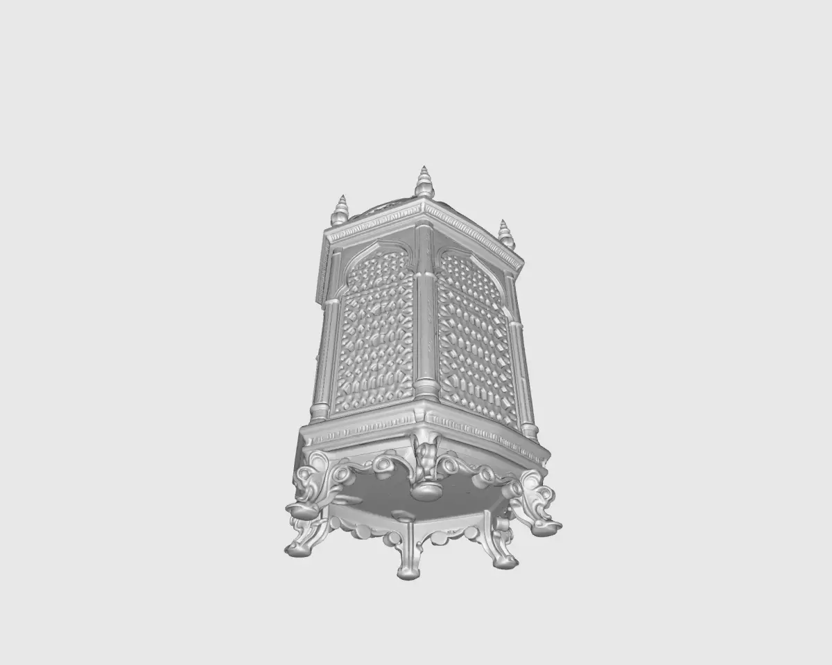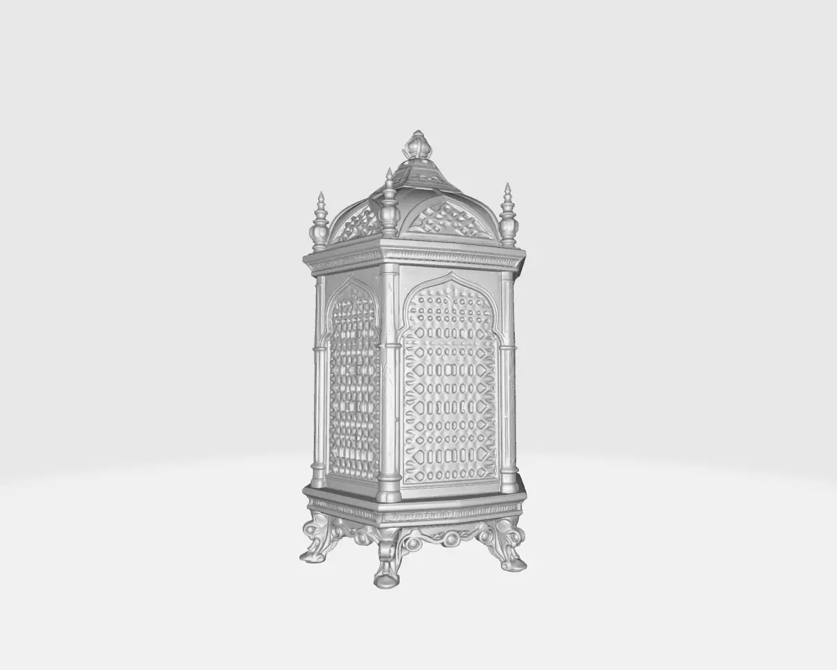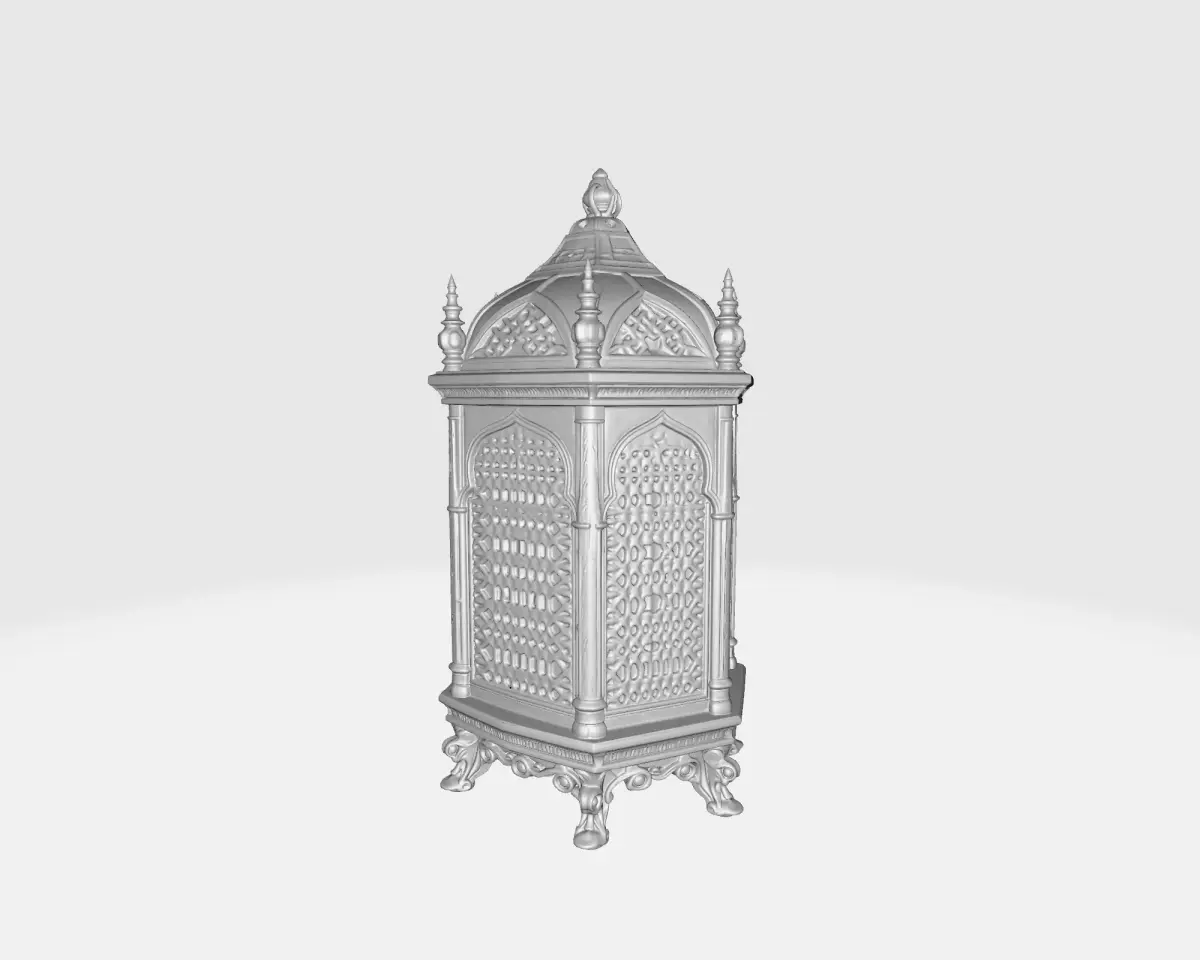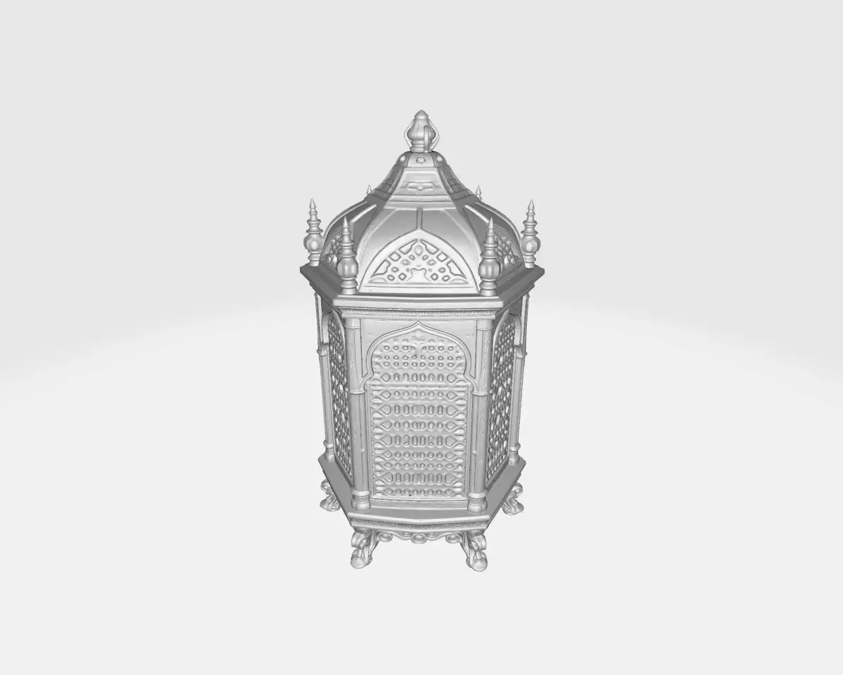 Celebrate the holy month of Ramadan by bringing a touch of traditional elegance into your home with this stunning 3D printable lantern. Modeled with a keen eye for detail, this Fanous captures the essence of classic Islamic architecture, featuring a hexagonal body adorned with complex geometric latticework (mashrabiya) that allows light to filter through beautifully. The design is topped with a graceful, ornate dome and stands on six detailed, curved feet, giving it a regal and stable presence on any surface.
