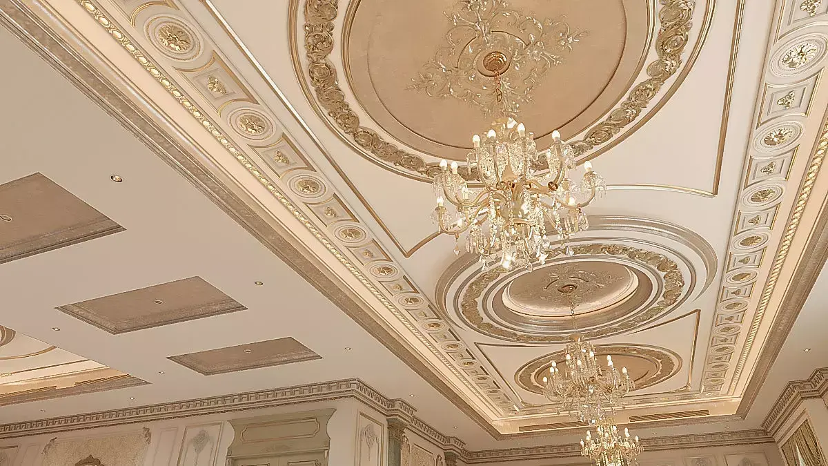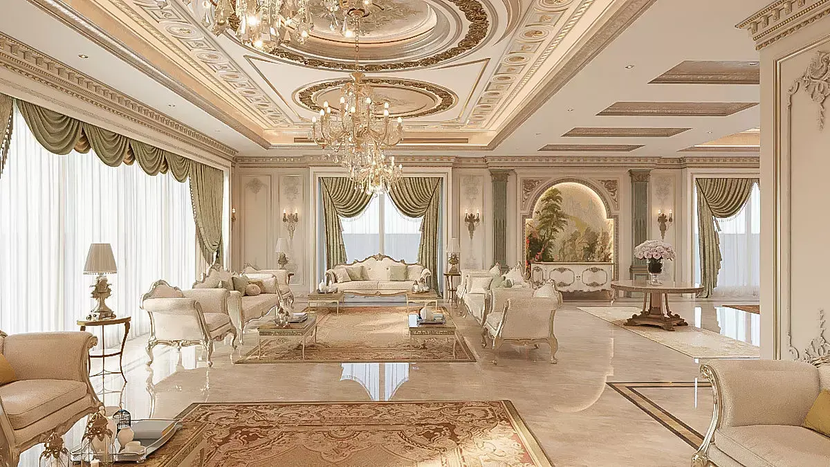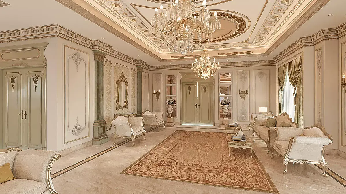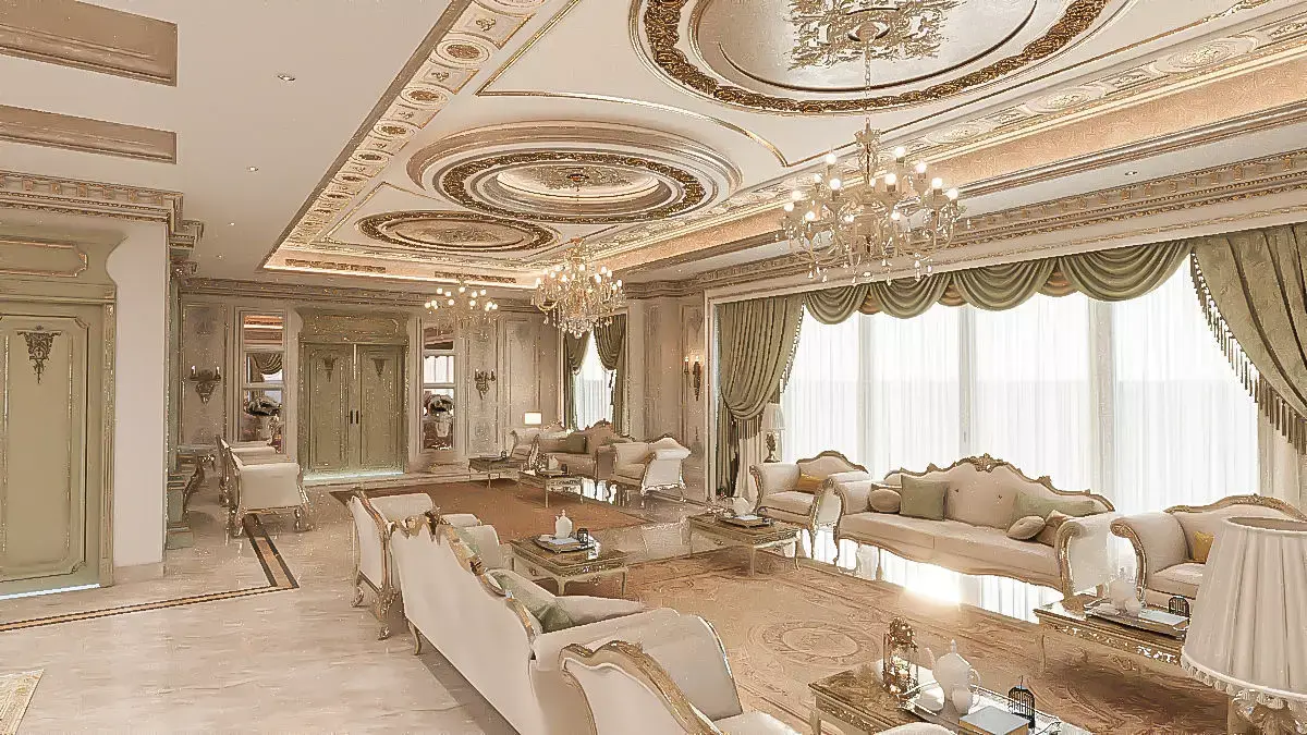 This classic sceneof a majlis roomwith luxury classic details and decorations containing a seating area and a dining area