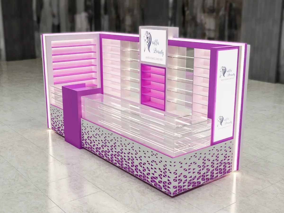 A selling makeup and cosmetics kiosk , its dimensions 4X1.5 M, for markets, malls and commercial centers, placed in the halls or internal squares, with all materials and interior lighting.