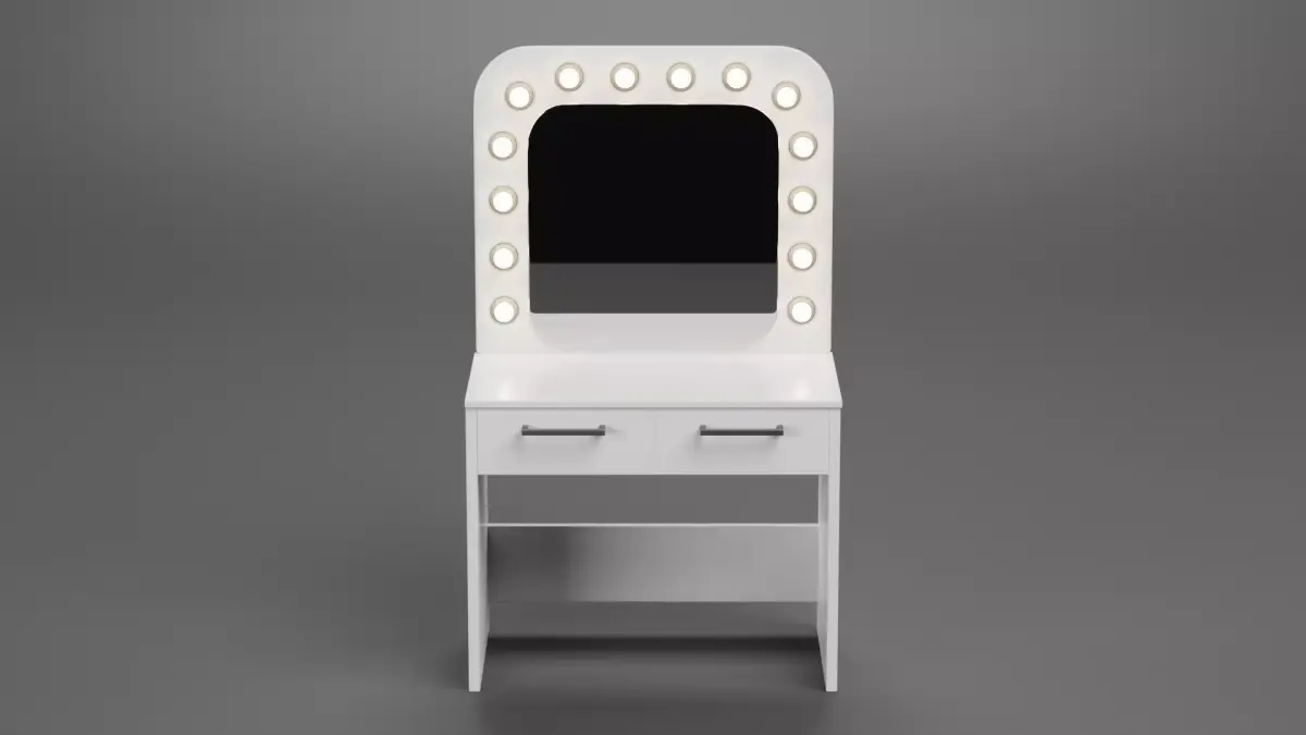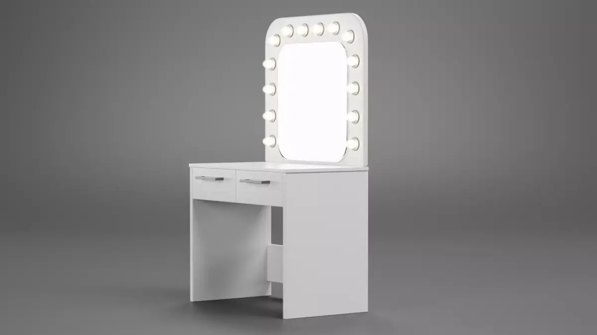 A classic vanity desk designed for beauty and dressing table scenes. The clean white makeup table features a large hollywood-inspired mirror framed by a curved row of studio-style bulbs, a familiar setup often associated with professional makeup stations and backstage dressing rooms. This recognizable vanity lighting layout helps create authentic beauty environments while keeping the design neutral and adaptable for different cosmetic product presentations.